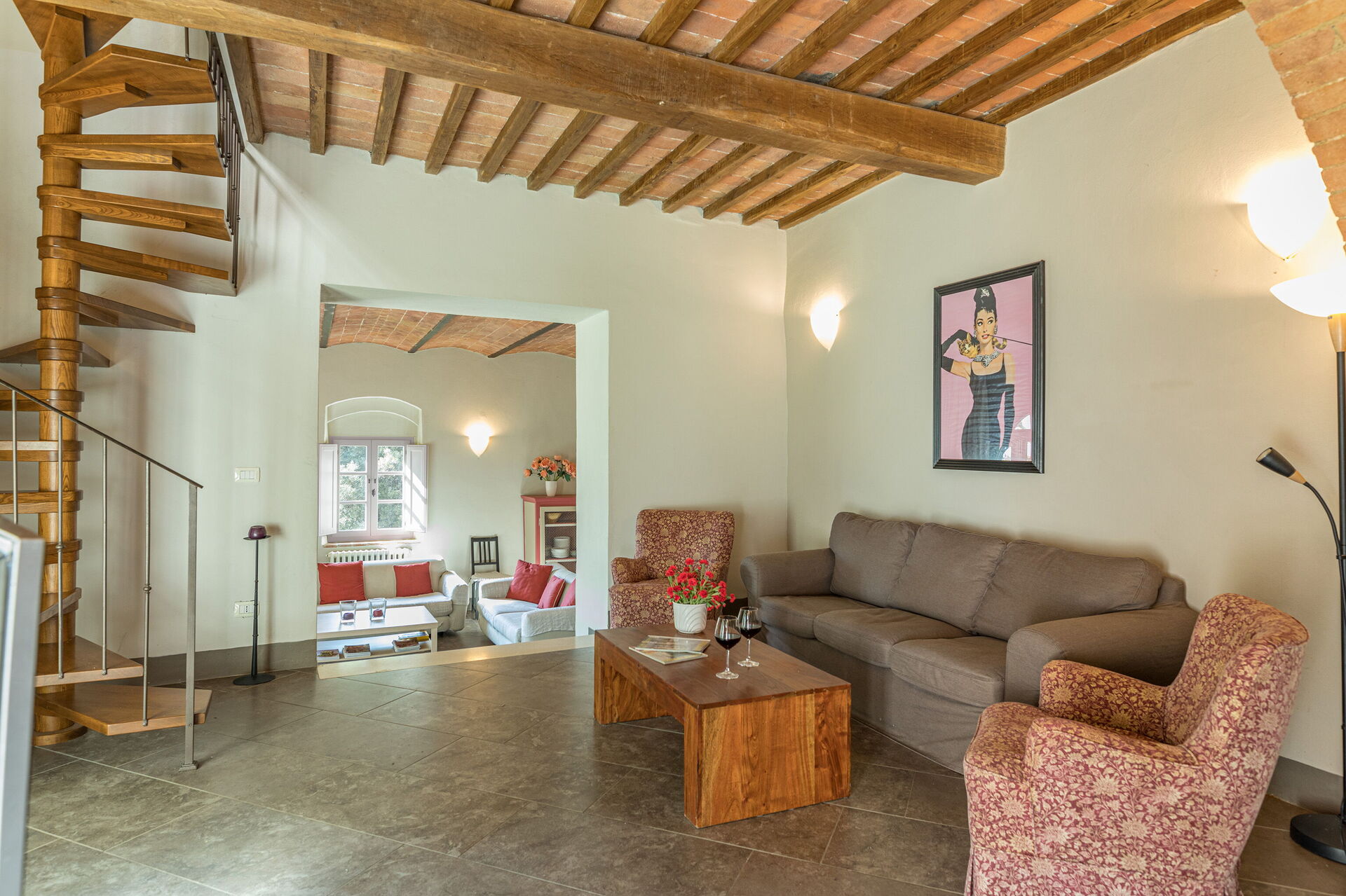 On the ground floor, the holiday villa in Tuscany, offers a large living-room, a dining room, a perfectly equipped kitchen, a single bedroom and two double bedrooms, one with en suite bathroom. All three bathrooms have a shower, sink, WC and bidet.