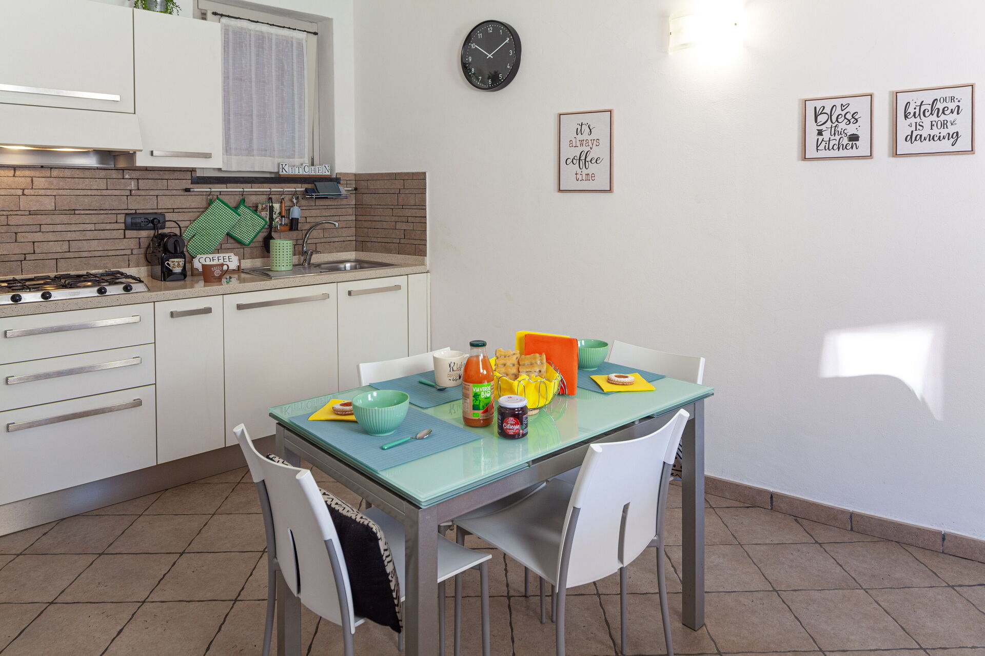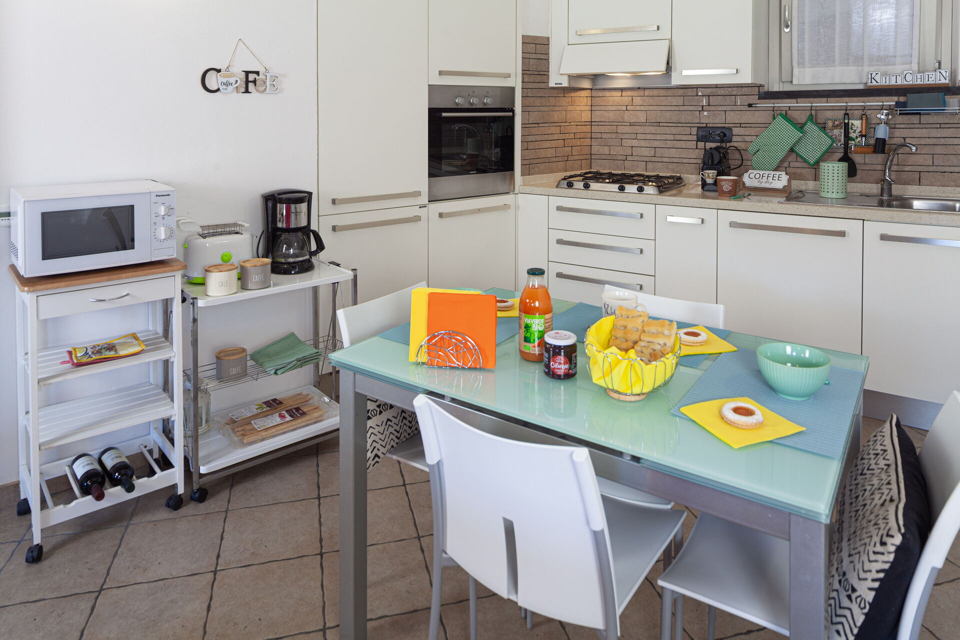 Køkkenområdet er fremragende udstyret: bord med stole, kogeplader, køleskab med fryser, ovn, opvaskemaskine, mikroovn, brødrister, amerikansk kaffemaskine, elkedel, Nespresso.