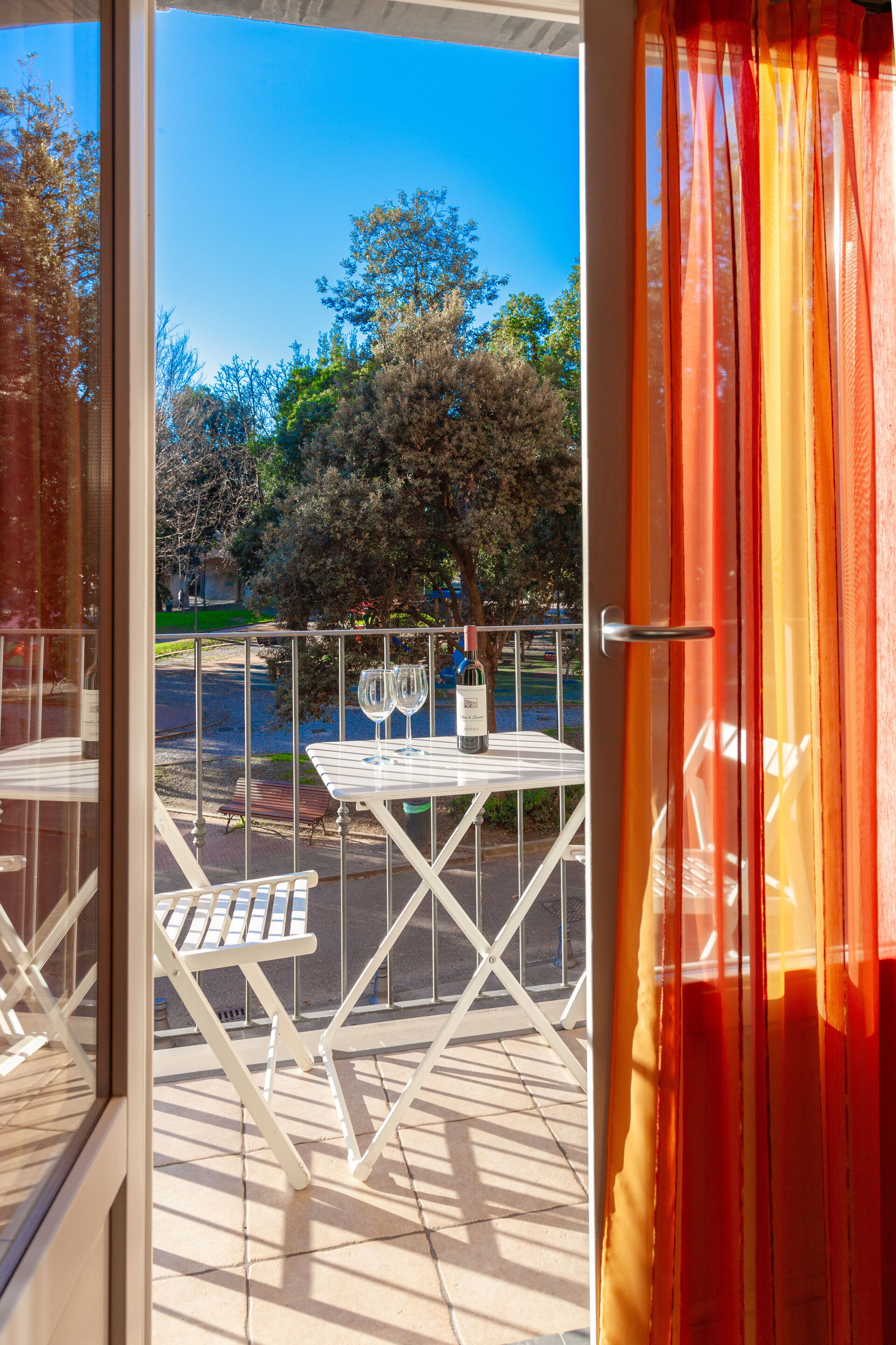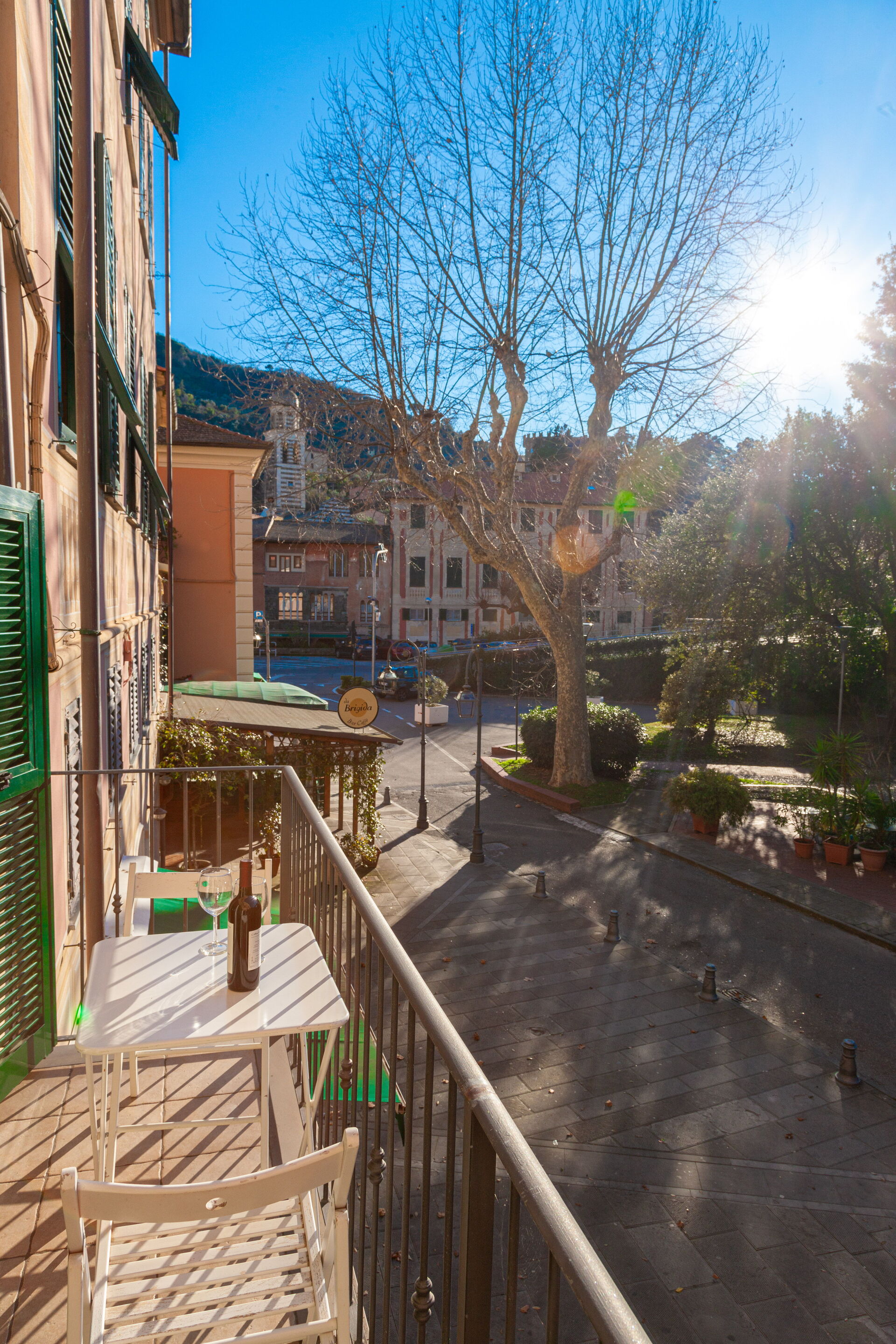 Balkonen, der er udstyret med et bord og stole, har udsigt over den grønne park Levanto (piazza Staglieno).
