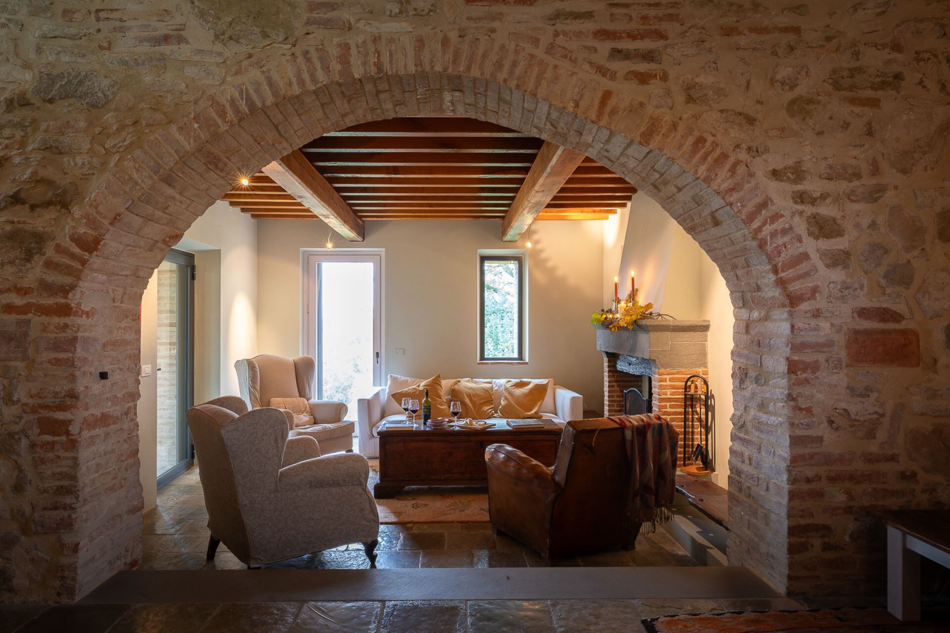 The interiors are captivating! Picture yourself lounging in a spacious sitting room by the fireplace, with big, inviting leather sofas just waiting for you to sink in and relax. The main house has an open, easy flow – the kitchen, dining area, and living spaces all blend beautifully, separated by a charming old brick arch. Upstairs, each of the four en-suite bedrooms has its