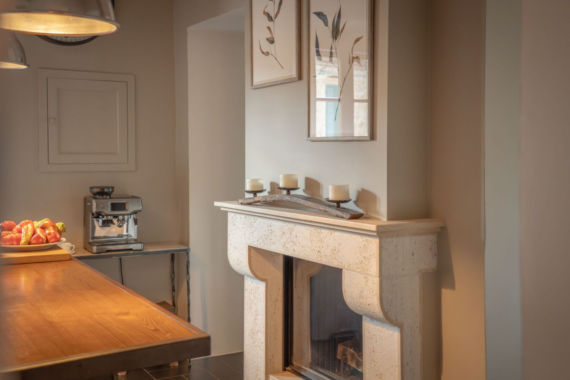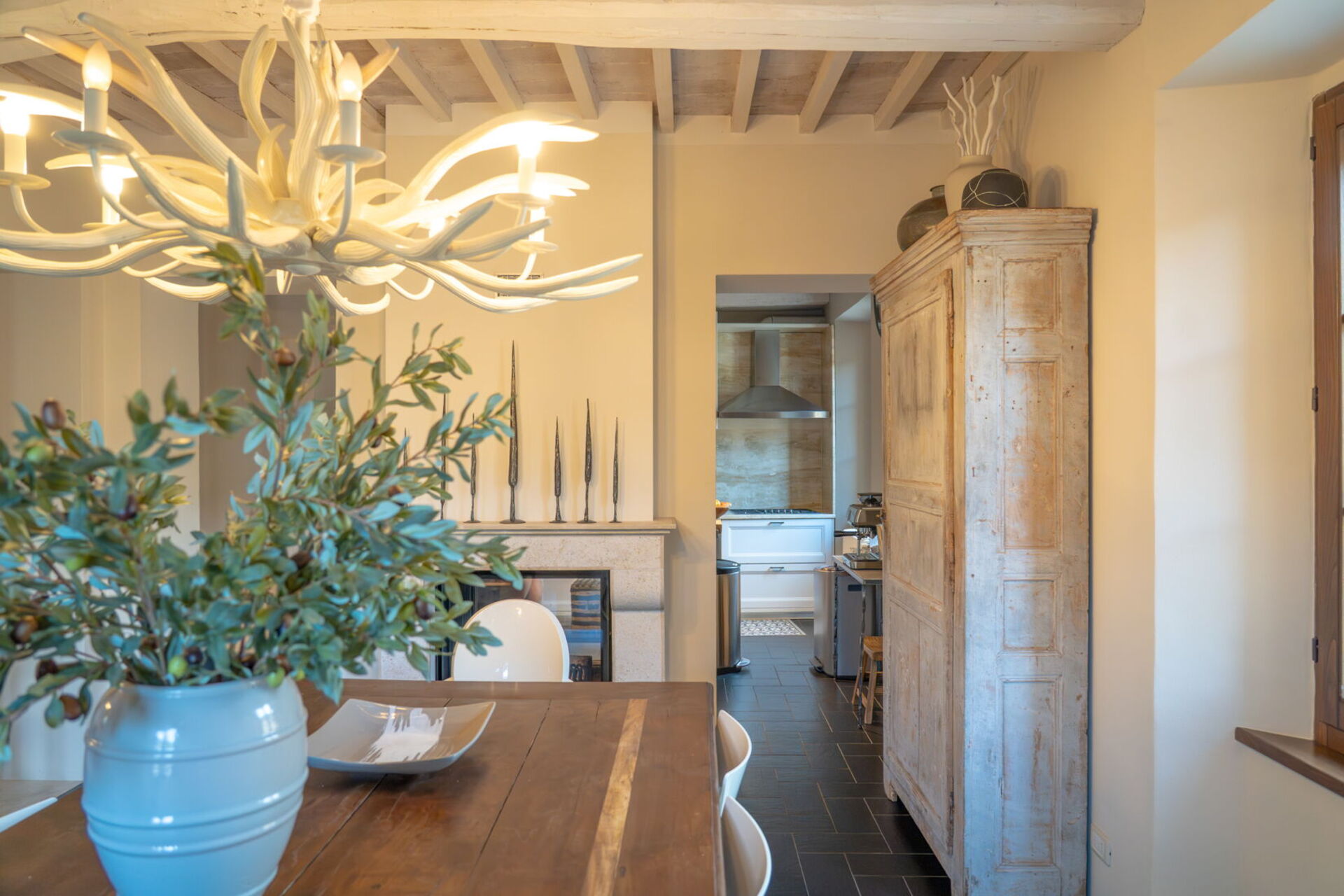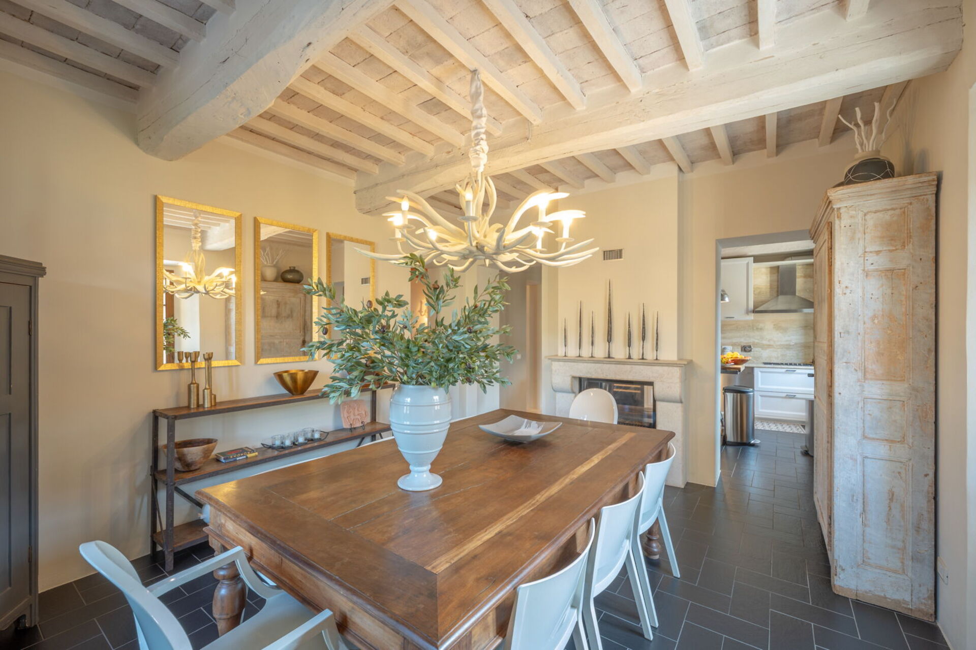 The dining room and kitchen are on either side of a lovely working fireplace, and if you prefer to dine at home there are cookware and utensils at your disposal. There is a charming breakfast terrace just off the dining room for a leisurely morning cappuccino in the Sun or an al fresco lunch or dinner outdoors.