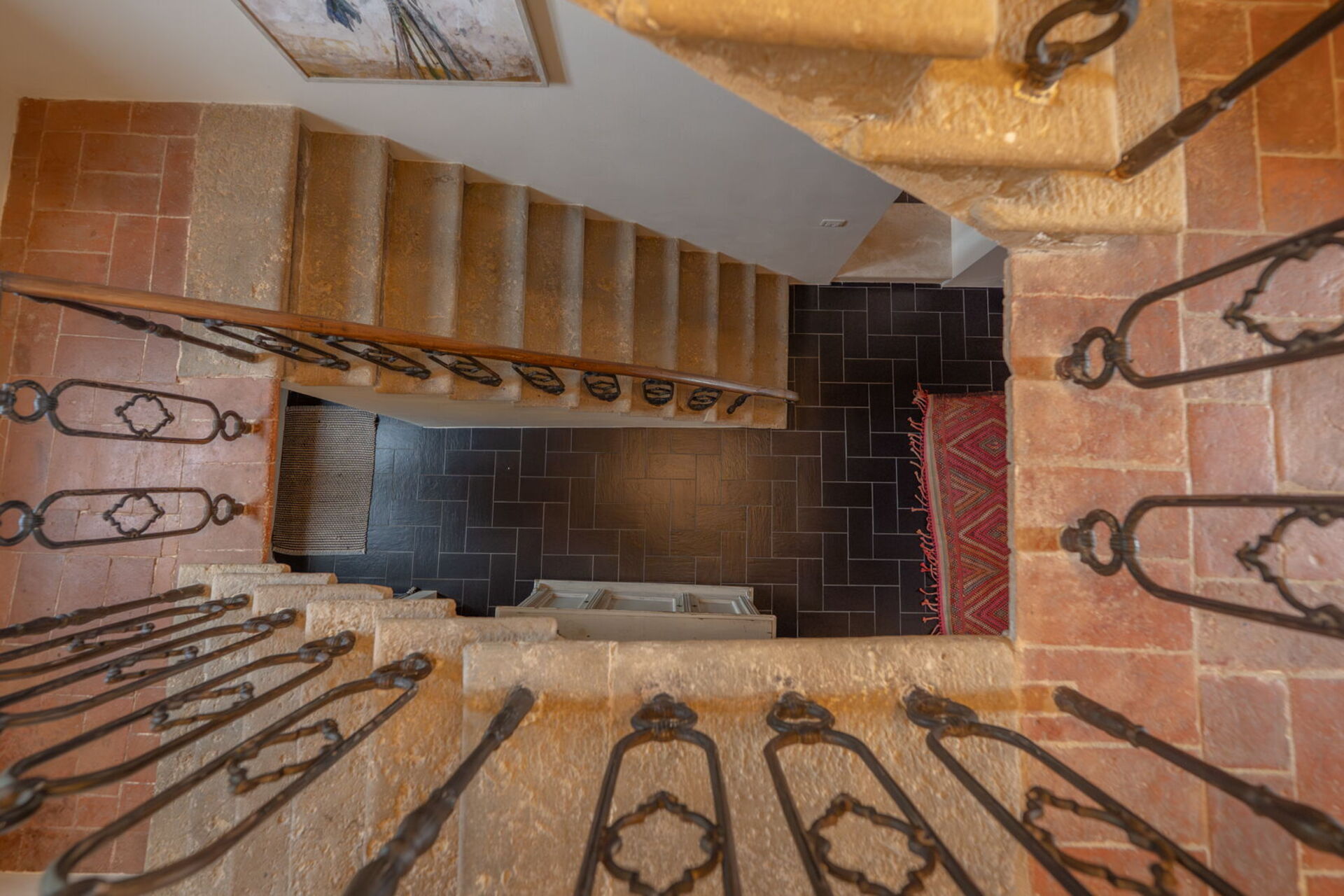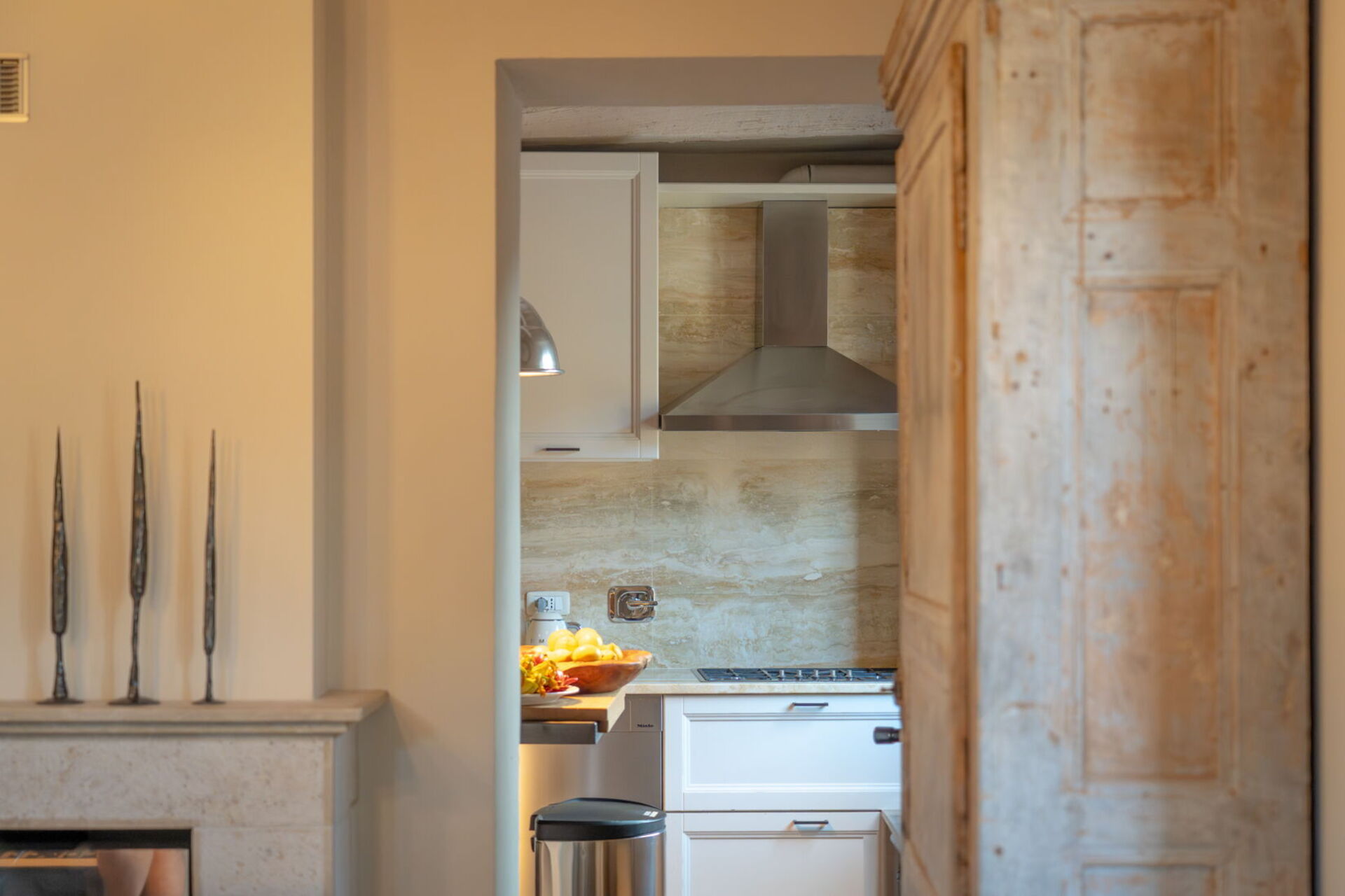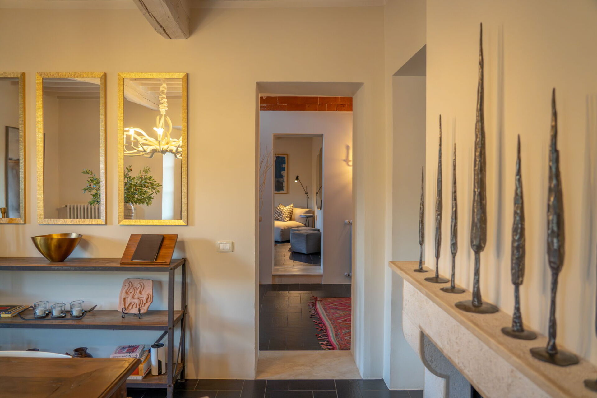 The dining room and kitchen are on either side of a lovely working fireplace, and if you prefer to dine at home there are cookware and utensils at your disposal. There is a charming breakfast terrace just off the dining room for a leisurely morning cappuccino in the Sun or an al fresco lunch or dinner outdoors.