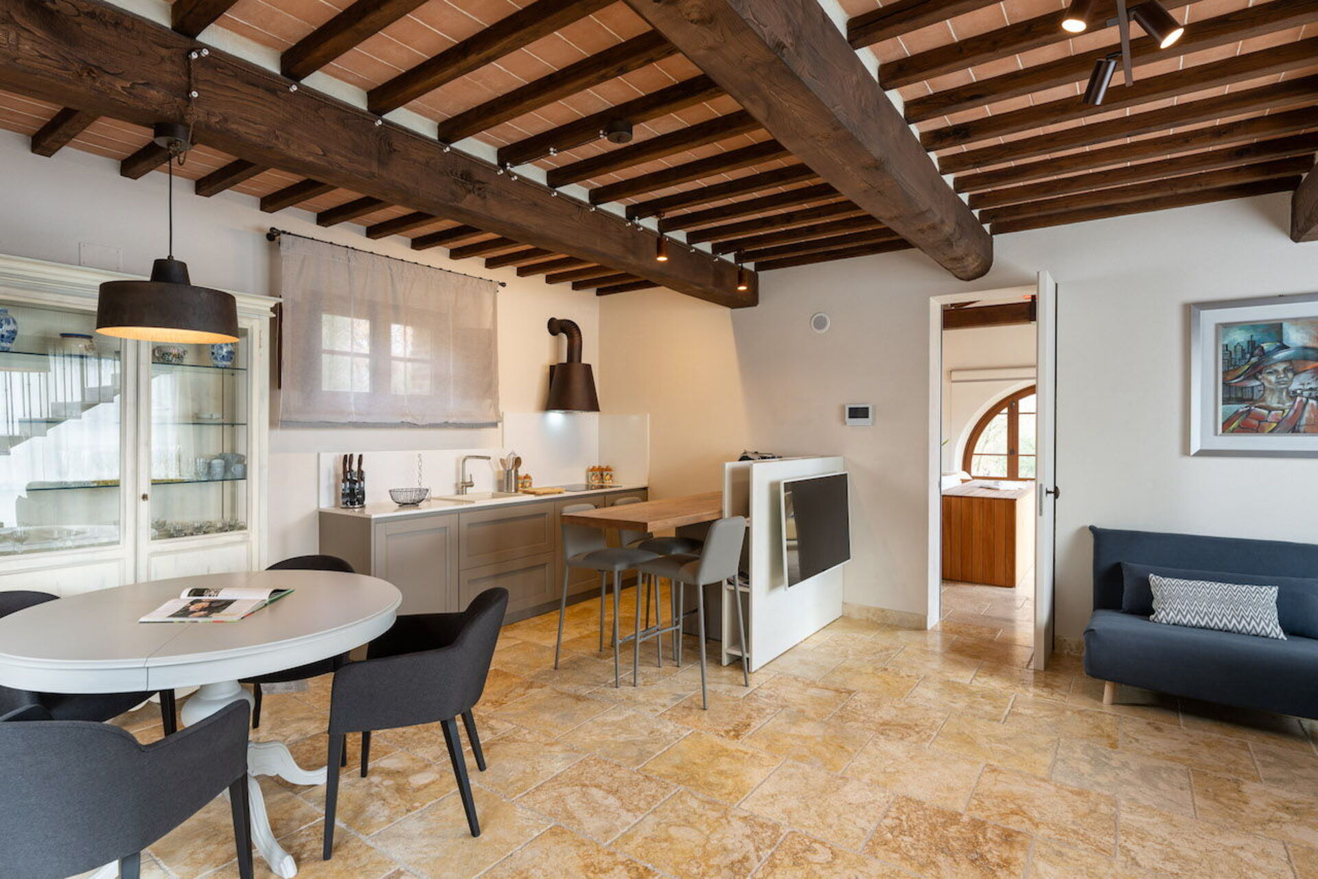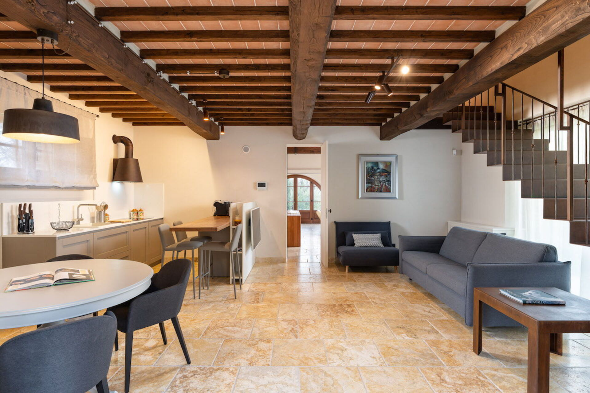 Køkken - stue: veludstyret køkken, spisebord (personer: 4), opvaskemaskine, køleskab, fryser, kogeplader, ovn, brødrister, italiensk kaffemaskine, amerikansk kaffemaskine, dobbelt sovesofa, WIFI internet, klimaanlæg, tv, røgalarm, co2 detektor, udgang til have.