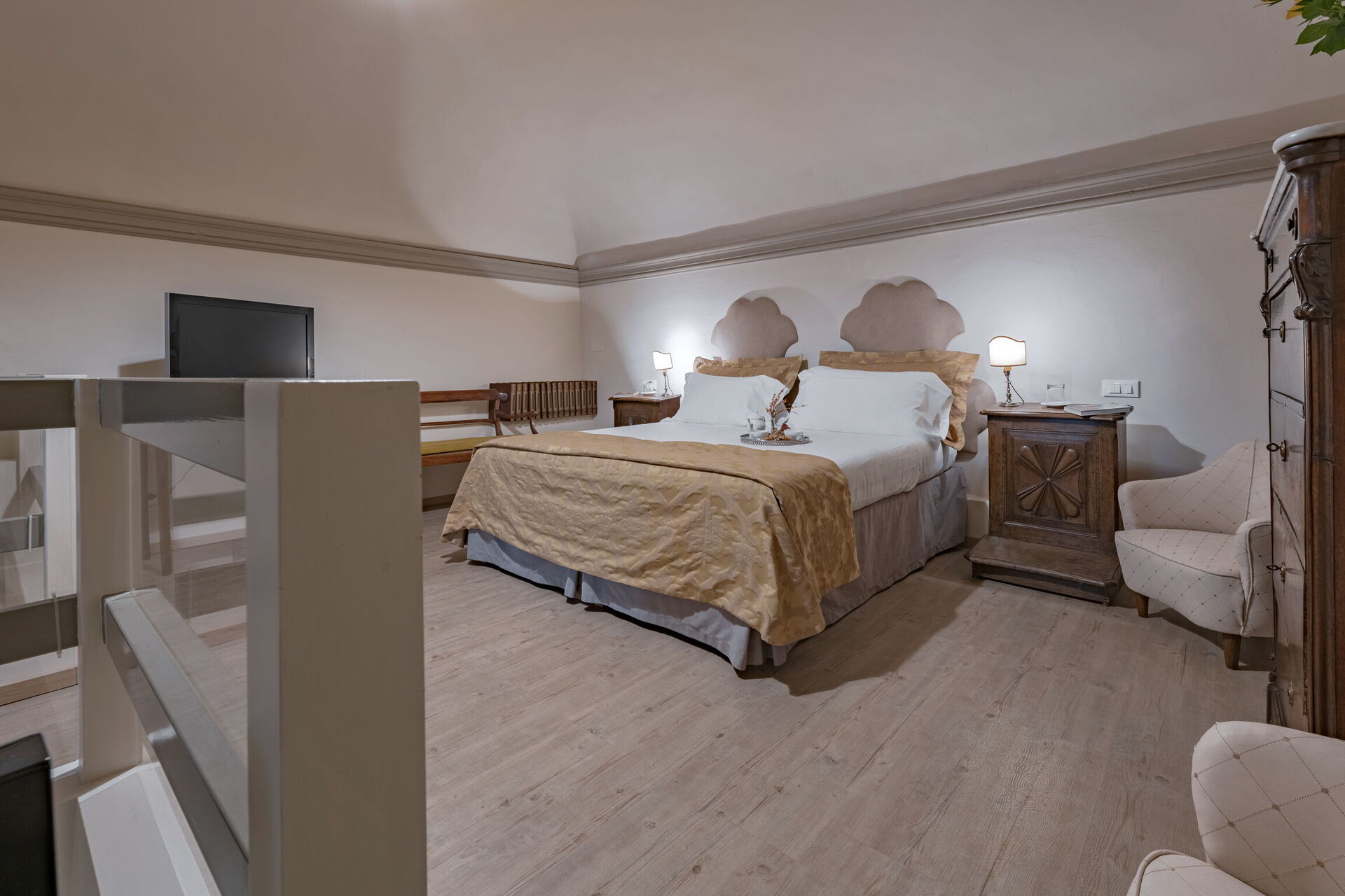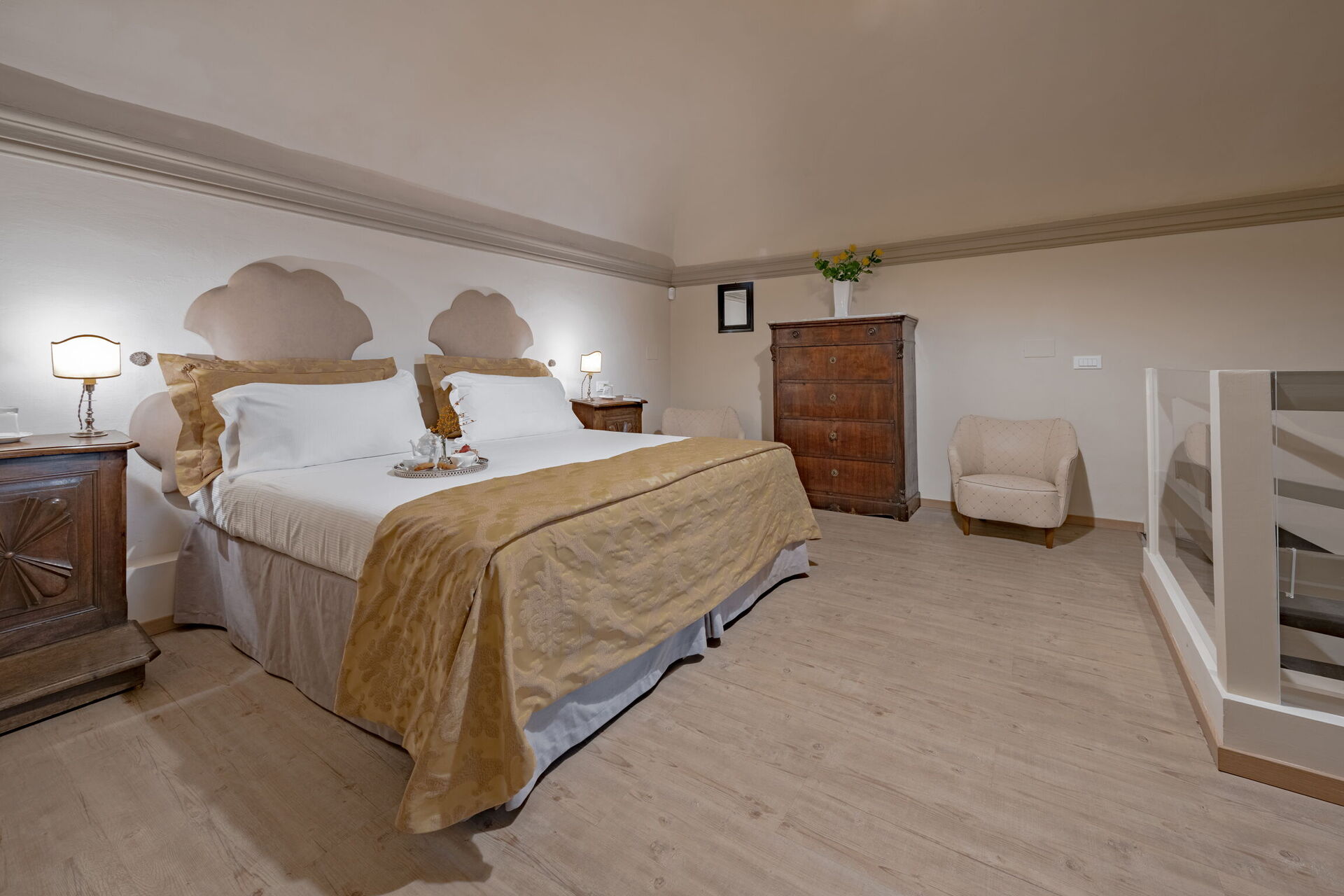 Soveværelse med tilhørende toilet (20 m2): king size seng, klimaanlæg, sofa, skrivebord, wc.