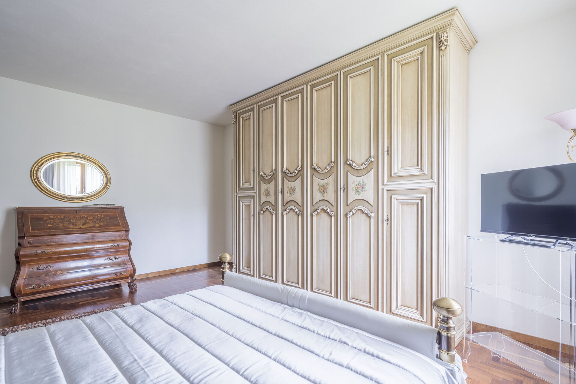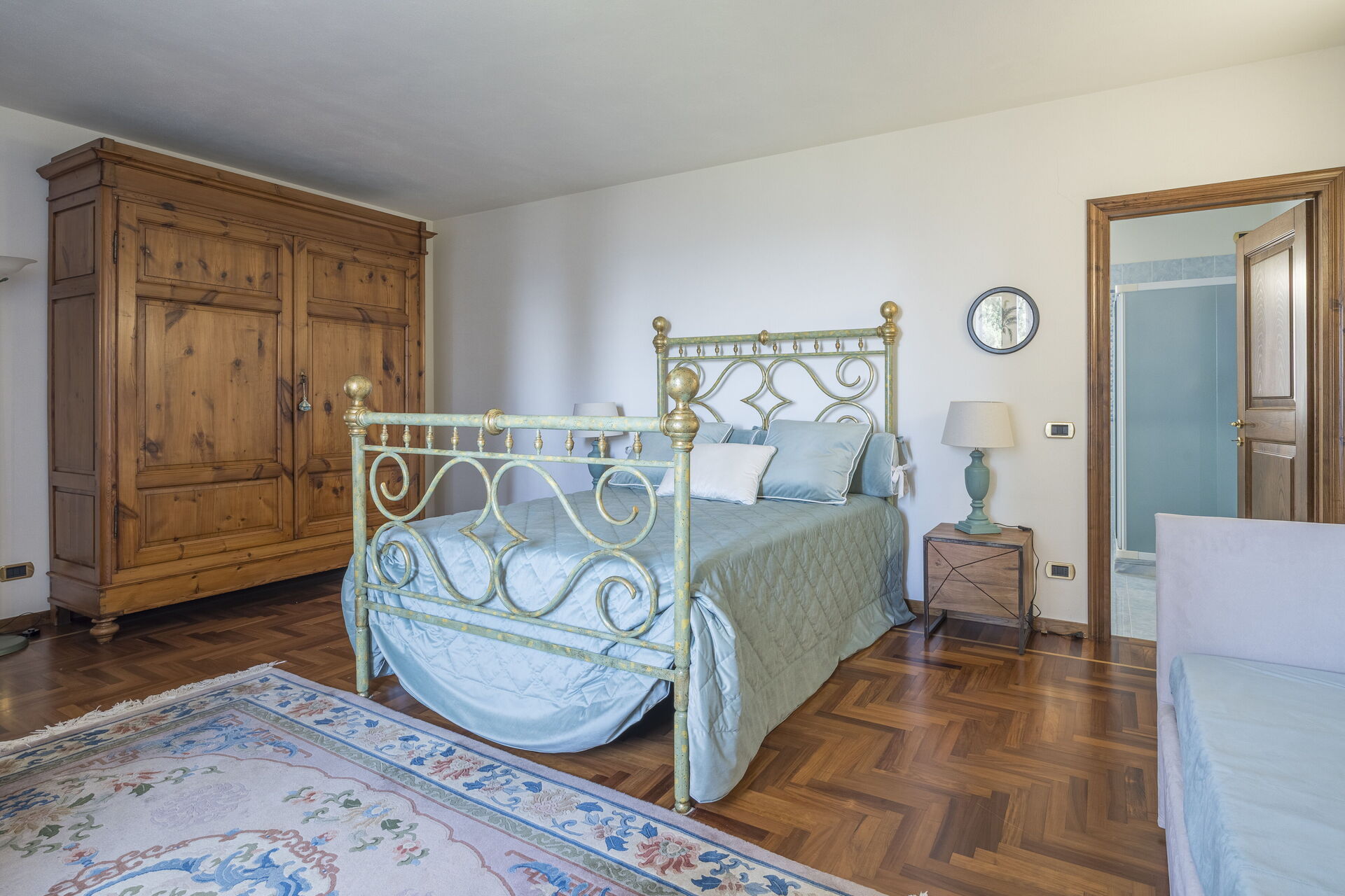 Soveværelse med bad 1: dobbeltseng, sovesofa, WIFI internet, klimaanlæg, tv, boblebad, vask, wc, bidet, hårtørrer.
