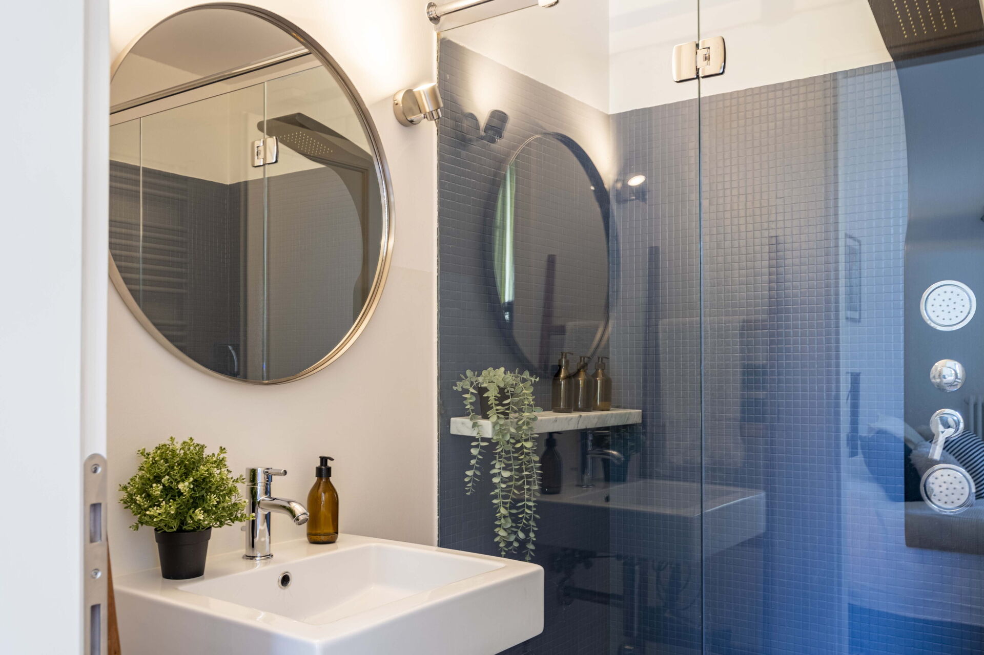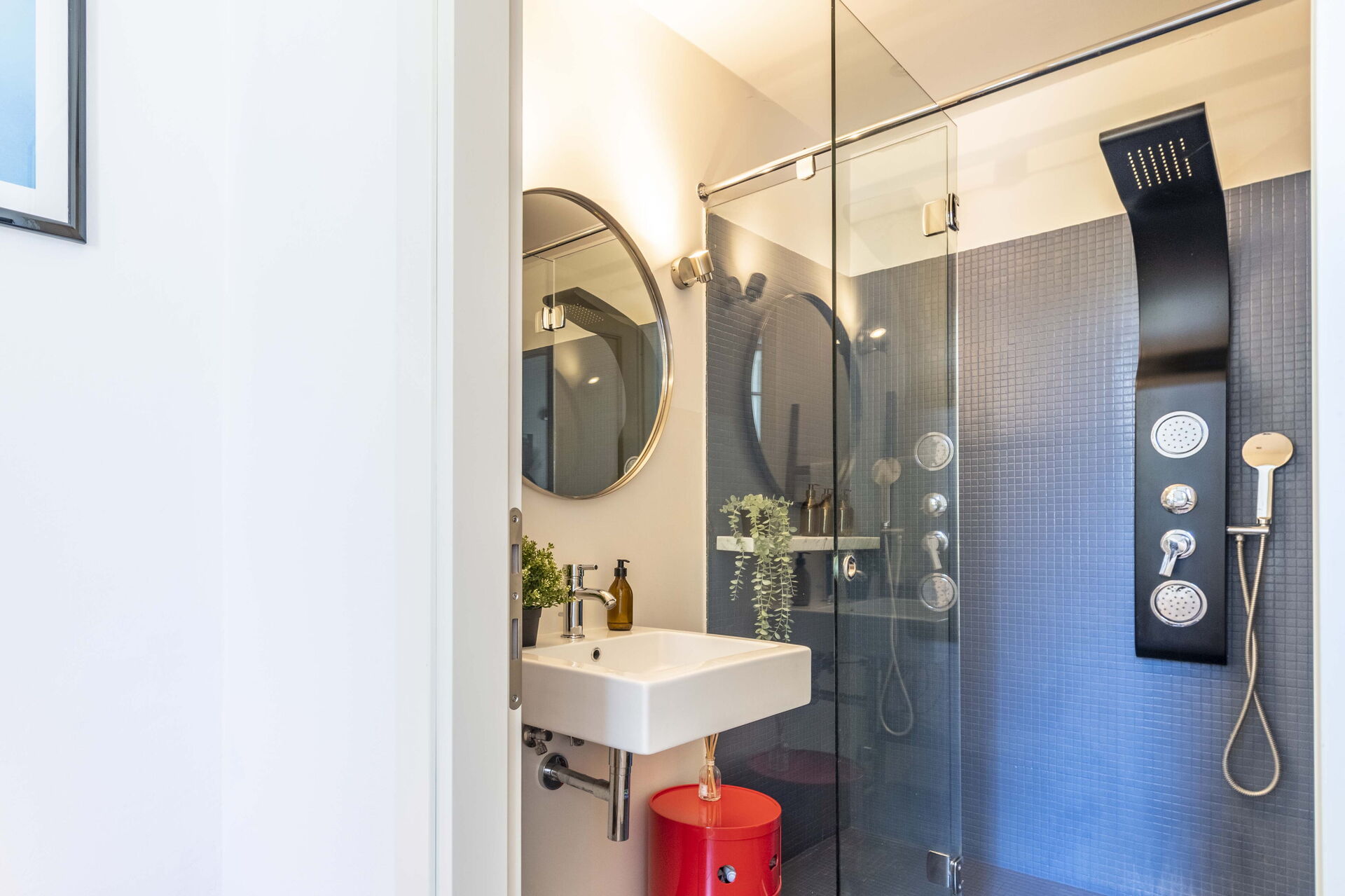 Badeværelse: vask, wc, bidet, bruser, hårtørrer.