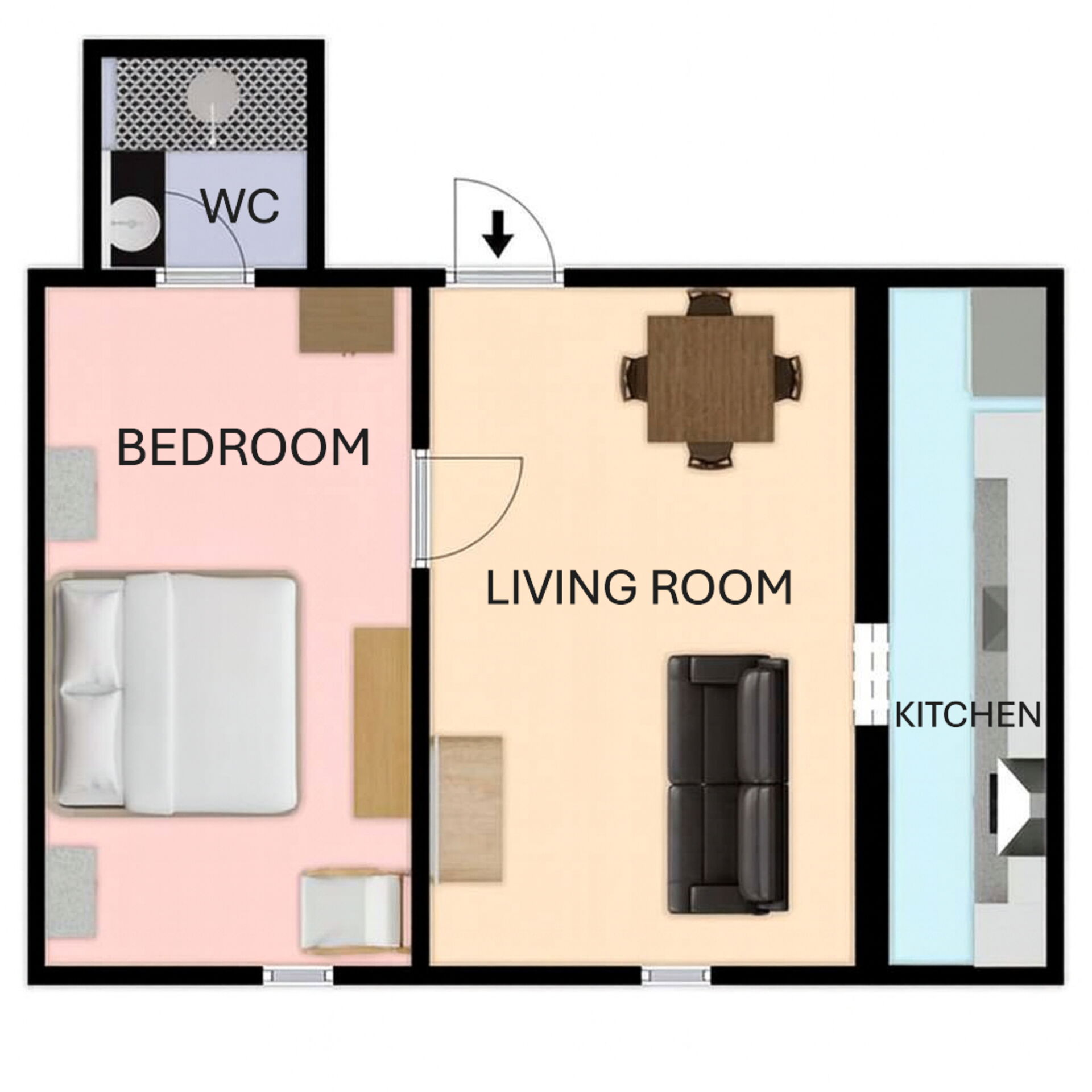Omfattende: køkken, stue, soveværelse, badeværelse.