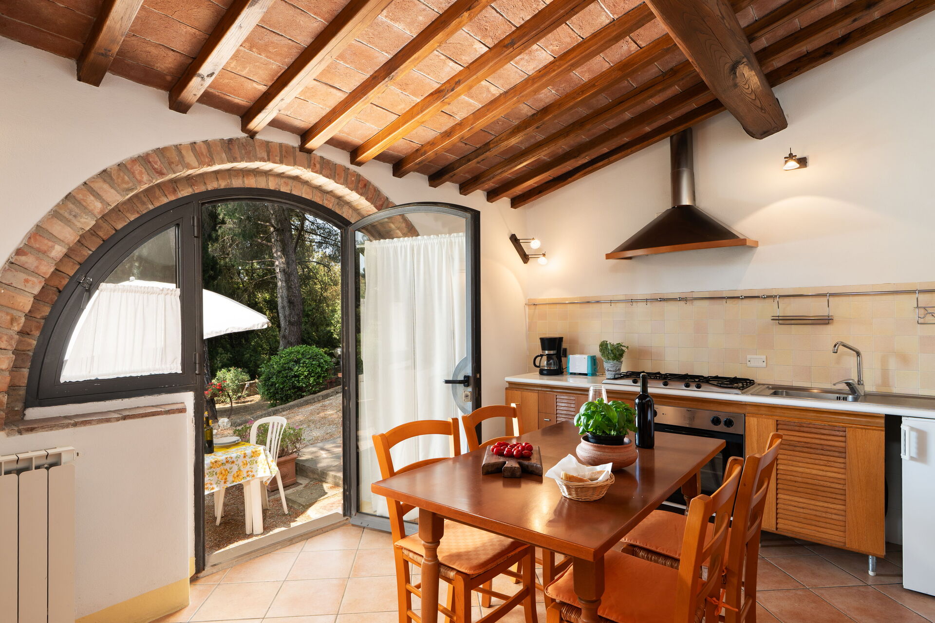 Køkken - stue 2: veludstyret køkken, spisebord, køleskab, mikroovn, kogeplader, ovn, brødrister, italiensk kaffemaskine, amerikansk kaffemaskine, kamin, WIFI internet, myggenet, satellit tv, røgalarm, udgang til have.