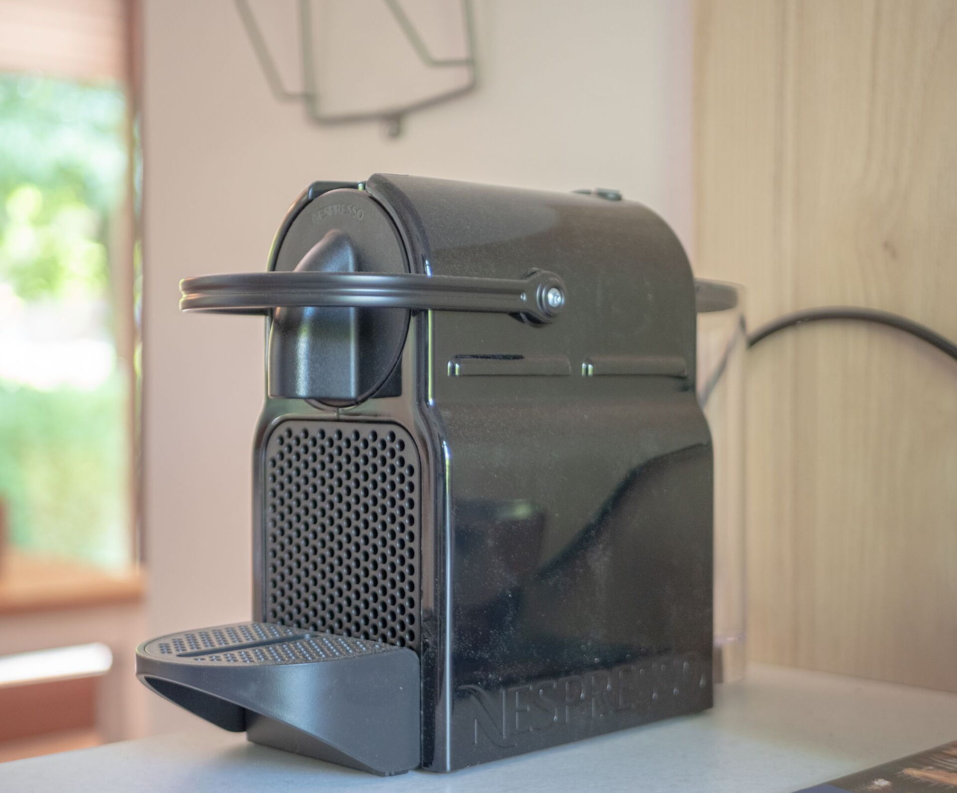 Kitchen with oven, coffee machine and 4-burner cooker.