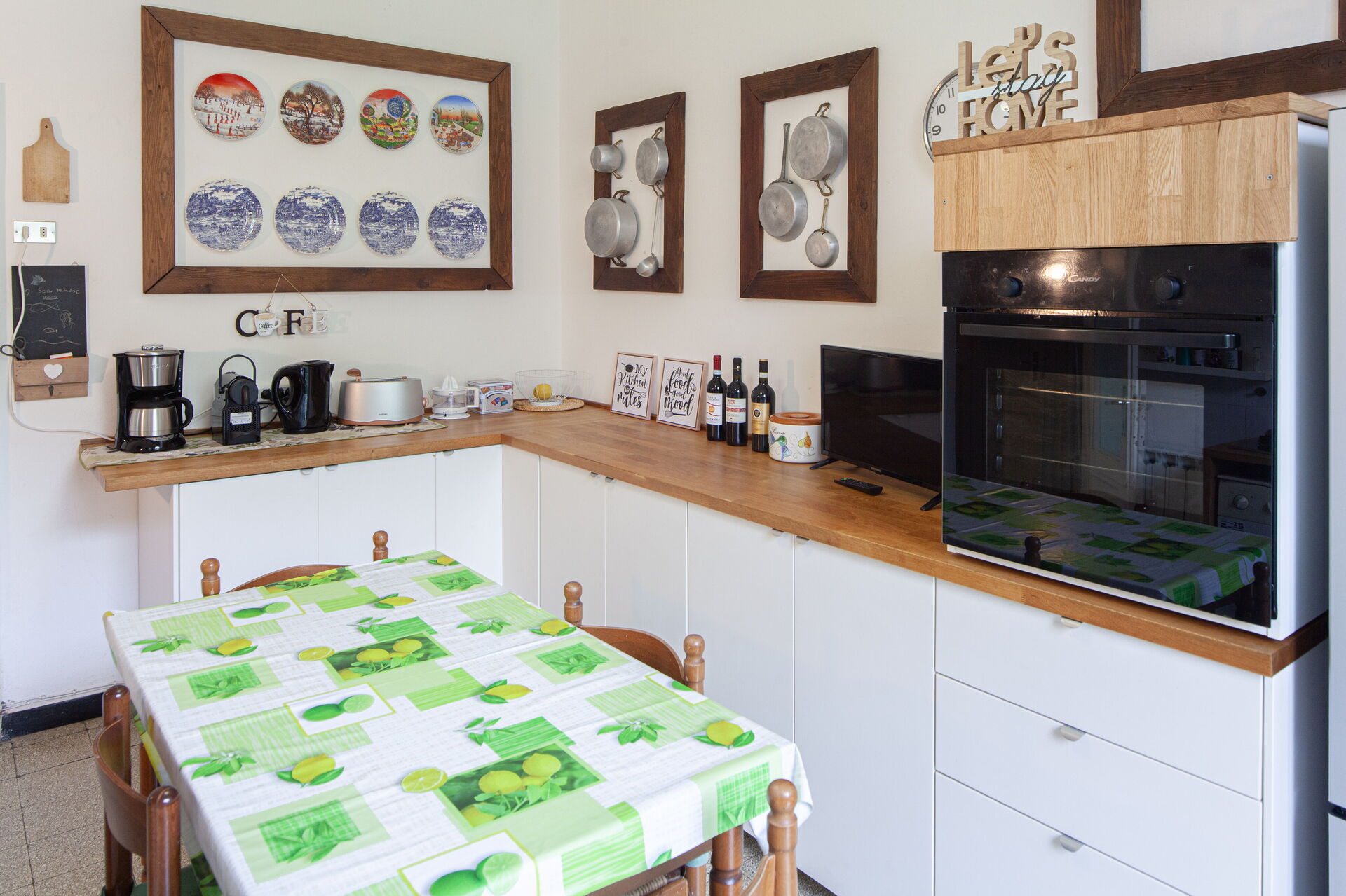 Meget veludstyret køkken, opvaskemaskine, vaskemaskine, kogeplader med 4 blus, ovn, køleskab, fryser, vask. Nespresso, amerikansk kaffemaskine, italiensk moka, elkedel, brødrister, stavblender, juicer. Spisebord med stole. TV.