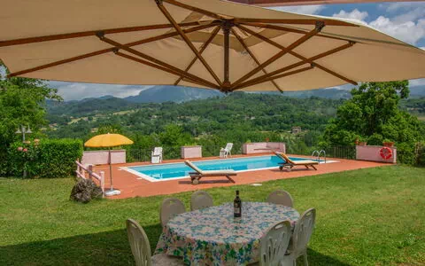 Hyggeligt, rustikt enfamiliehus "Casa dei Ciliegi", 475 meter over havets overflade, bygget i 1800, renoveret i 2000, omgivet af træer og græsmarker. I byen, 2 km fra bymidten af Castelnuovo Garfagnana, rolig, solrige beliggenhed, 100 m fra søen, i det grønne. Til alene benyttelse: stor have 300 m2 (indhegnet) med blomster og træer, pool (11 x 6 m, 140 - 140 cm dyb, Sæsonbestemt tilgængelighed: 15.Maj. - 30.Sep.). Brus/toilet i poolområdet. I huset: trådløs LAN [WLAN], vaskemaskine. 100 m lang, besværlige tilkørsel til til huset. Parkeringsplads (for 4 biler) på grunden. Fødevarebutik 2.5 km, supermarked 2.5 km, restaurant 2.5 km, busstoppested 100 m, banegård 2.5 km. Nærliggende attraktioner: Rafting Bagni di Lucca 2.5 km, Versilia 48 km, Lucca 35 km, Torre di Pisa 65 km, Sentiero Fortezza delle Verruccole 7 km. Bemærk venligst: bil anbefales. Velegnet for familier, babyudstyr på forespørgsel (inkl.).