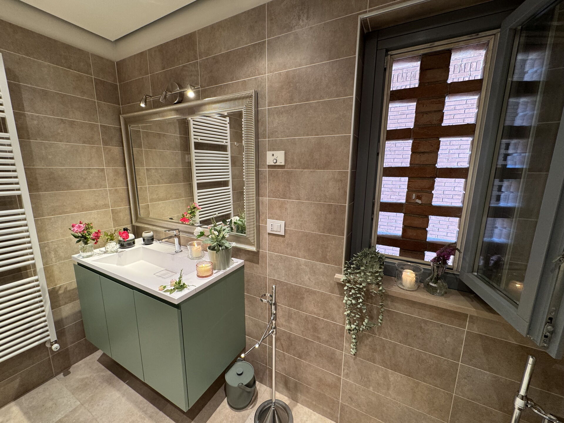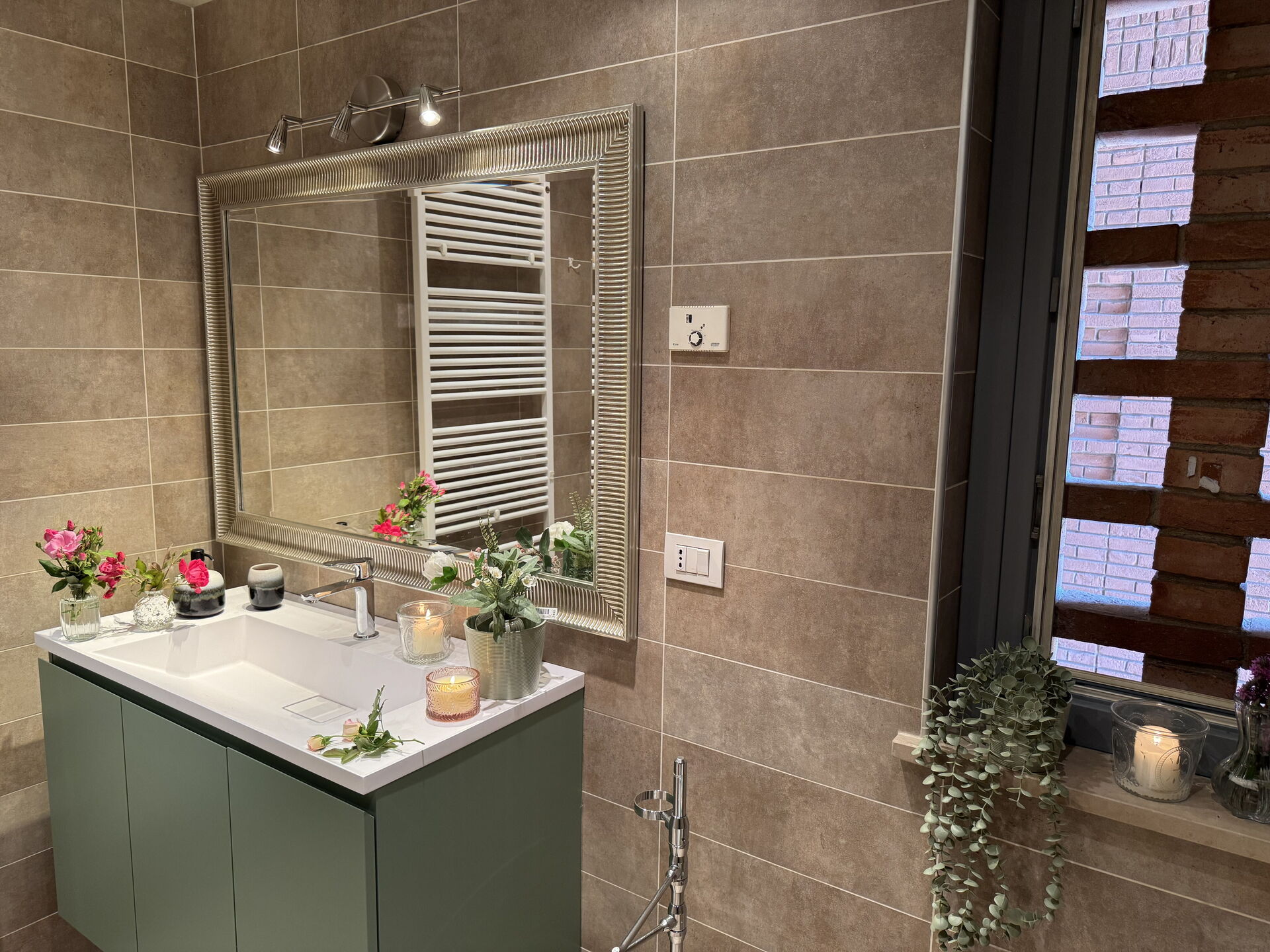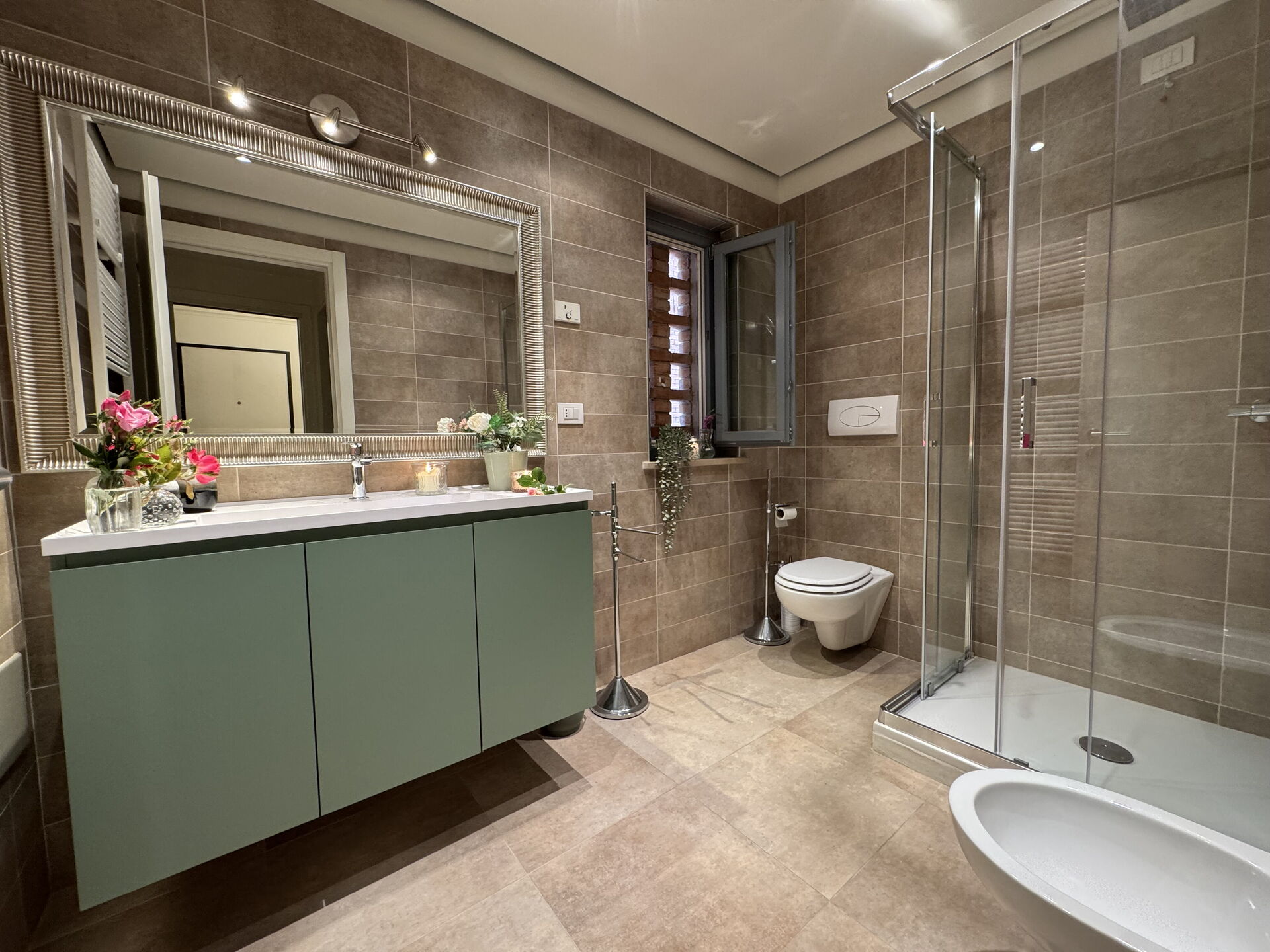 Badeværelse: vask, wc, bidet, bruser, hårtørrer.