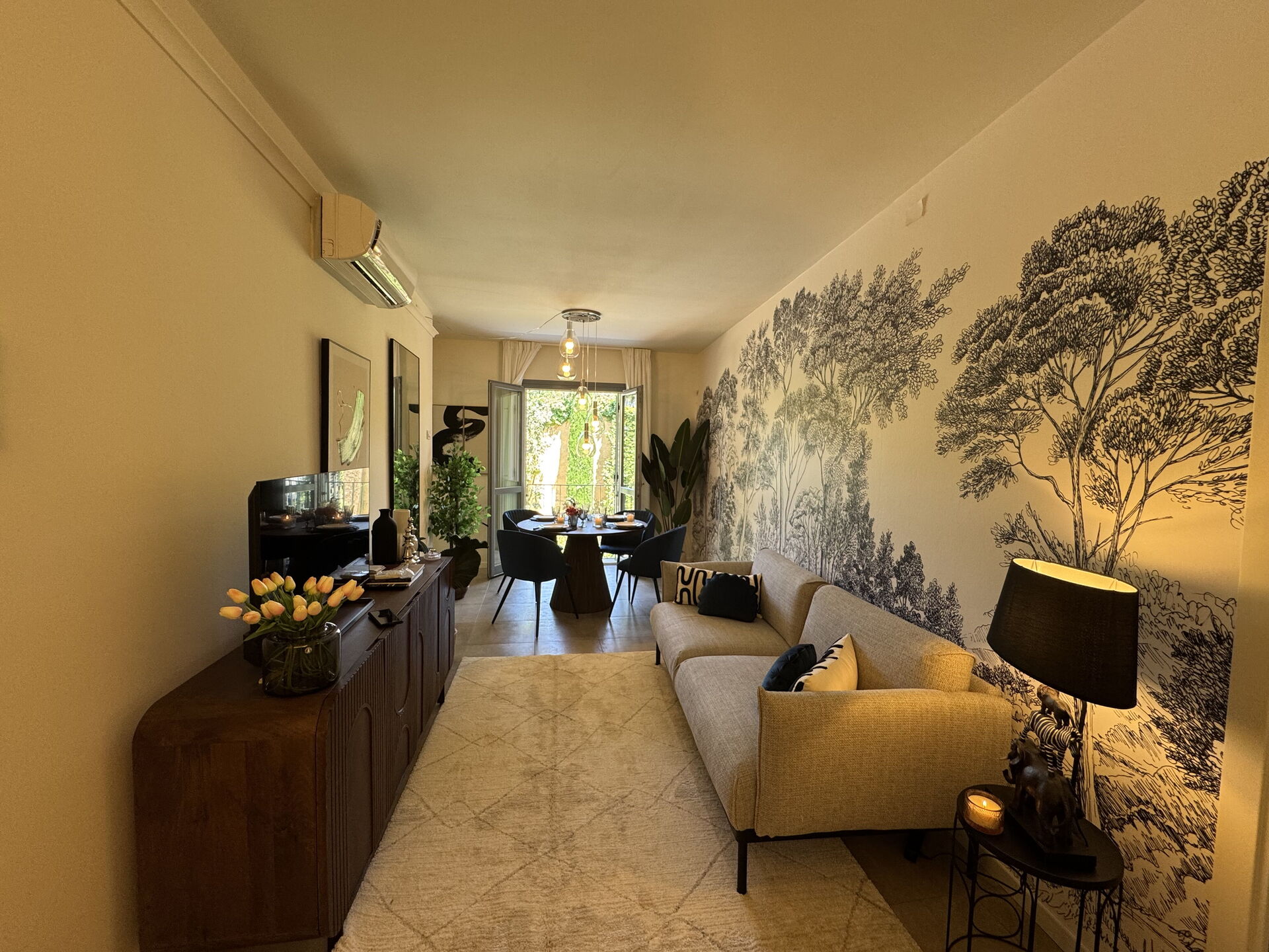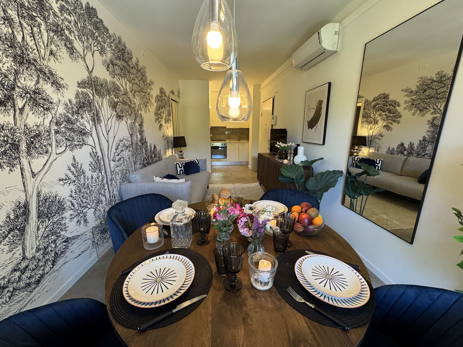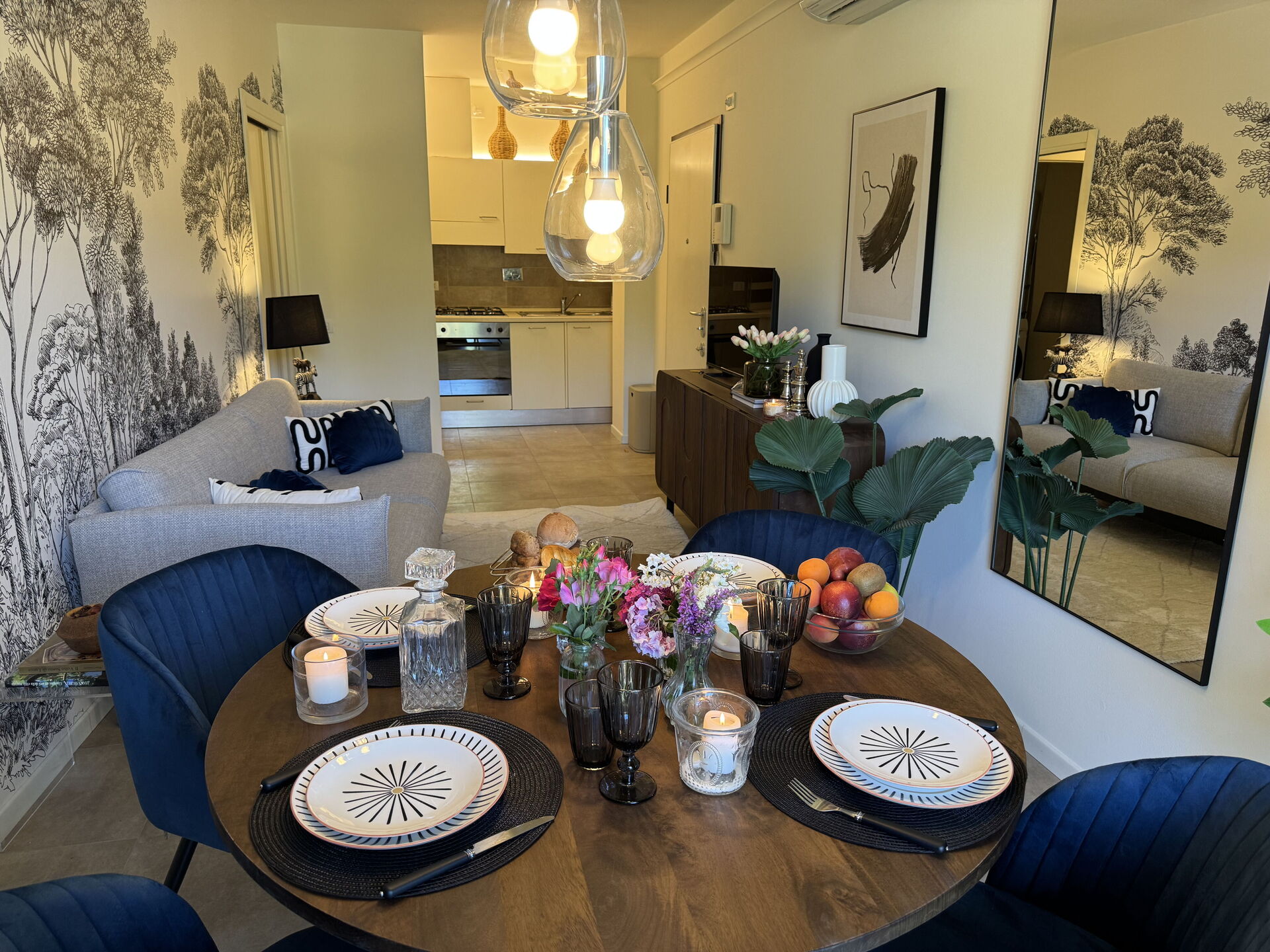 Køkken - stue: veludstyret køkken, spisebord, opvaskemaskine, køleskab, fryser, ovn, brødrister, italiensk kaffemaskine, vaskemaskine, sofa, klimaanlæg, tv.