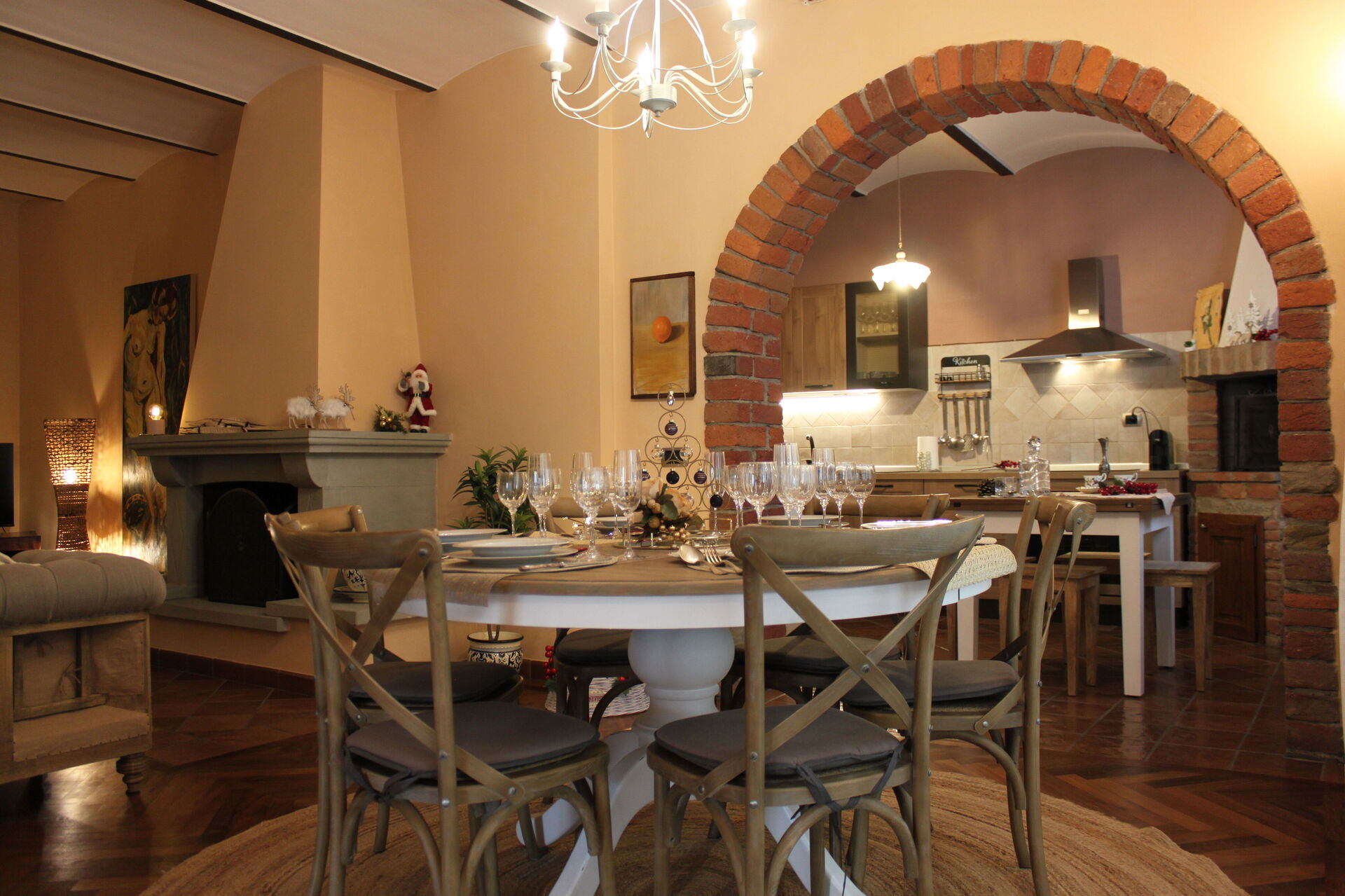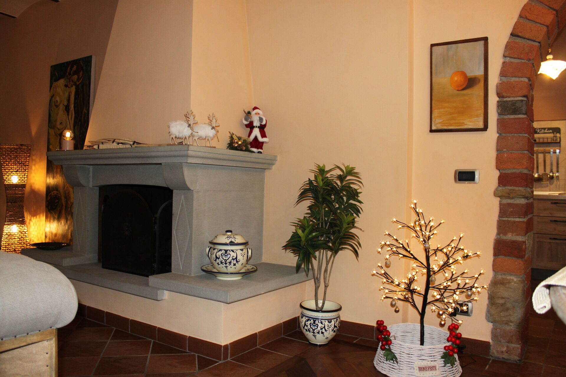 Køkken - stue: veludstyret køkken, spisebord, opvaskemaskine, køleskab, fryser, mikroovn, kogeplader, ovn, brødrister, italiensk kaffemaskine, amerikansk kaffemaskine, sofa, lænestol, kamin, WIFI internet, internet, myggenet, høj stol, satellit tv, udgang til have.