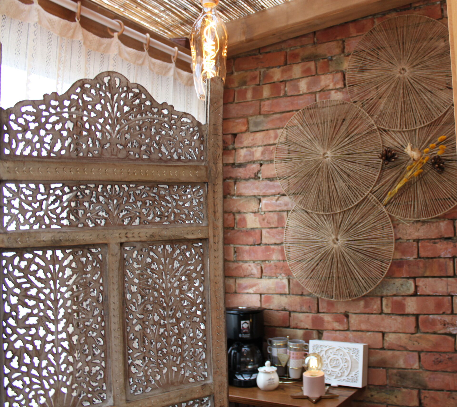 Stue: lænestol, kamin, myggenet, udgang til terrasse.