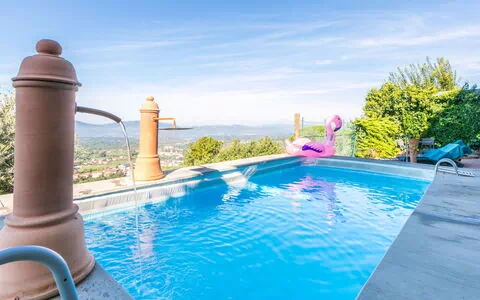 Hus på landet 450 meter over havets overflade, ensidig tilbygget. 1.4 km fra bymidten af Reggello, 30 km fra centrum af Greve in Chianti, 40 km fra bymidten af Firenze, høj beliggenhed på en bakke, i det grønne. Til alene benyttelse: have i forskellige niveauer (indhegnet), pool med varme, indhegnet (8 x 6 m, 140 cm dyb, Sæsonbestemt tilgængelighed: 04.Apr. - 24.Okt.). Brus/toilet i poolområdet, havemøbler. I huset: centralvarme, Opvarmningen betales lokalt, opvarme kun tilgængelig fra 01.Nov. - 04.Apr.. Kok muligt (ekstra). Parkeringsplads på grunden. Indkøbsforretning, fødevarebutik, supermarked 700 m, busstoppested 2 km, banegård "Figline Valdarno" 12 km, badesø "Bilancino" 70 km. Tennis 1 km, ridehal 1 km. Nærliggende attraktioner: Castelfranco di Sopra 12 km, Vallombrosa 13 km, Loro Ciuffenna 21 km, Gaiole in Chianti 36 km, Panzano in Chianti, Radda in Chianti 38 km, Siena 75 km. Bemærk venligst: bil anbefales.