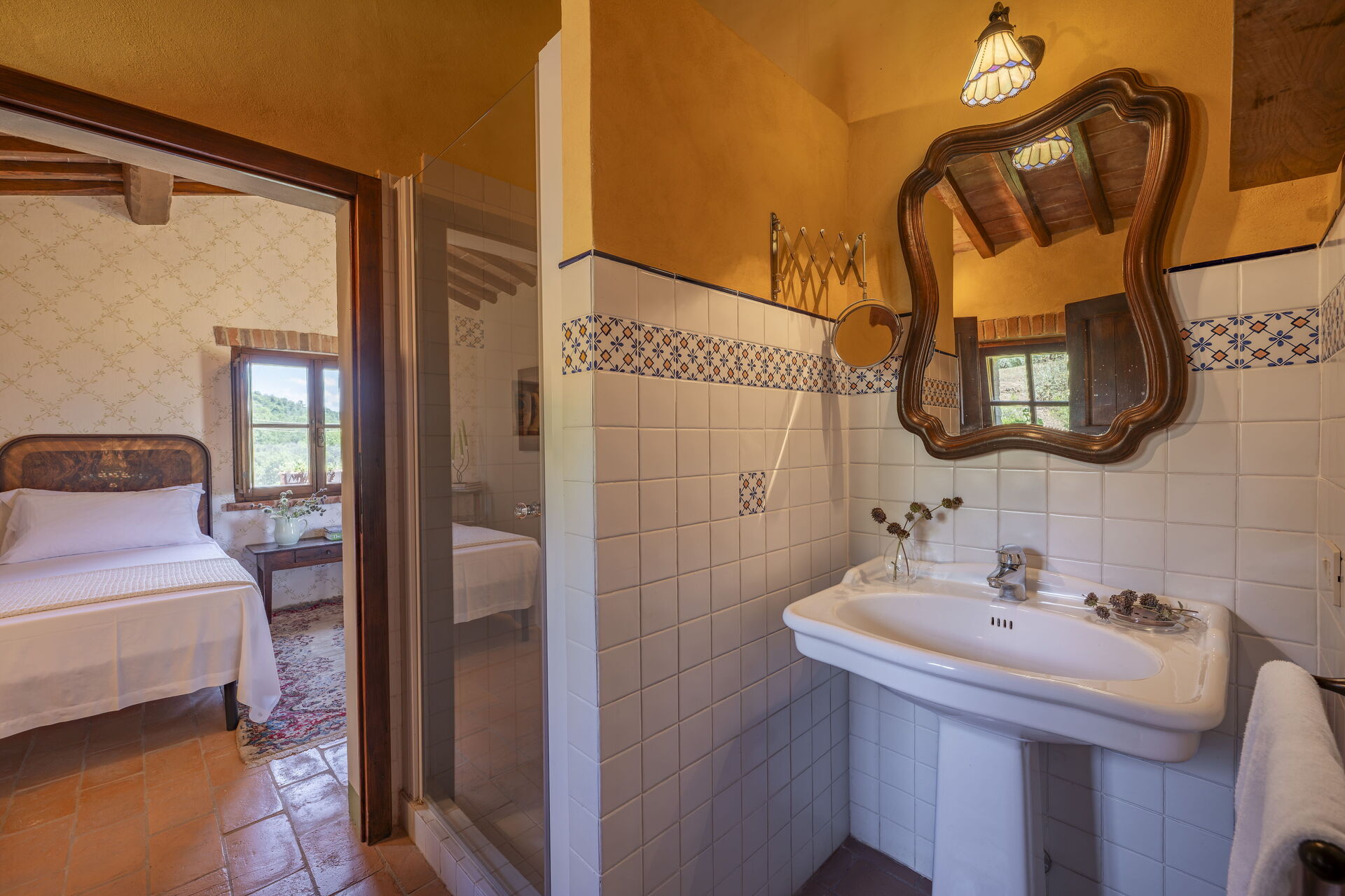 Soveværelse med bad: fransk seng, WIFI internet, internet, vask, wc, bruser, udgang til have.