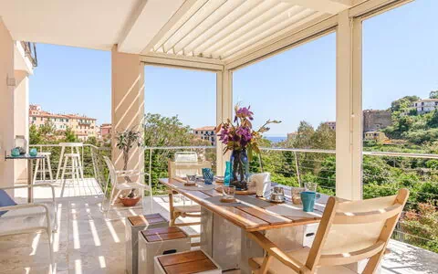 4-værelse-villa 110 m2 på 2 etager. Lys, moderne og smagfuld indrettet: åben stue/spisestue med skydedør, panoramavindue med spisebord og TV. Udgang til terrasse. 1 værelse med 1 dobbeltseng (160 cm). Udgang til terrasse. Åbent køkken (ovn, opvaskemaskine, 4 Induktionskomfur, kedel, mikroovn, fryser, elektrisk kaffemaskine, kogeø). Udgang til terrasse. Brus/bidet/WC. Overetage: 3 værelse, alle værelser med 1 dobbeltseng (160 cm). Udgang til terrasse. Brus/bidet/WC. Klimaanlæg, varmluftsopvarming. Stor terrasse delvis overdækket, stor terrasse, havesiddeplads. Havemøbler, grill, liggestole. Meget flotte udsigt over havet og by. Til benyttelse: vaskemaskine, hårtørrer. Internet (trådløs LAN [WLAN], gratis). Parkeringsplads. E-ladestation. Bemærk venligst: ikke-ryger lejlighed. Privat indgang, brandalarm, brandslukker. IT049021C24KYKM8AD