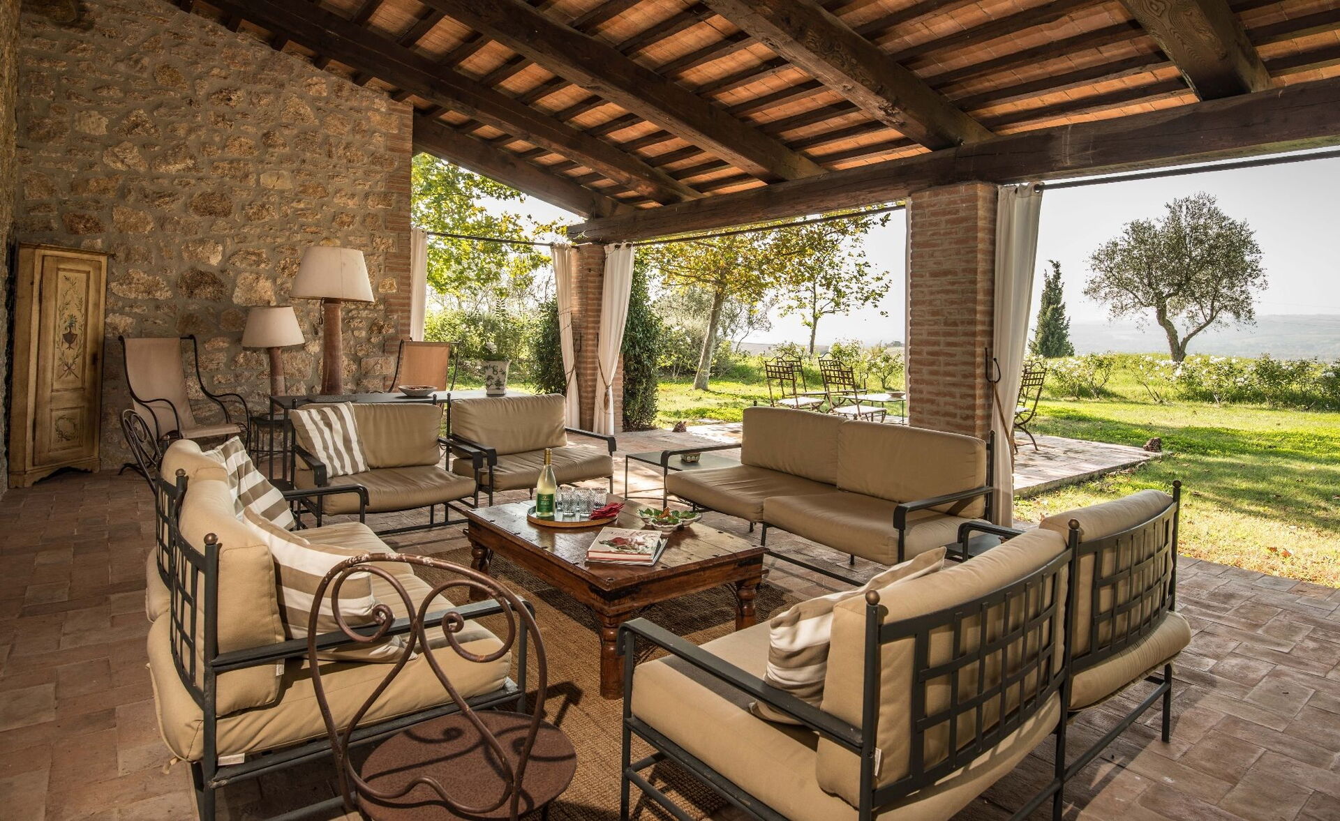 Summer living room with comfortable sofas and armchairs. Stunning view over the countryside!
