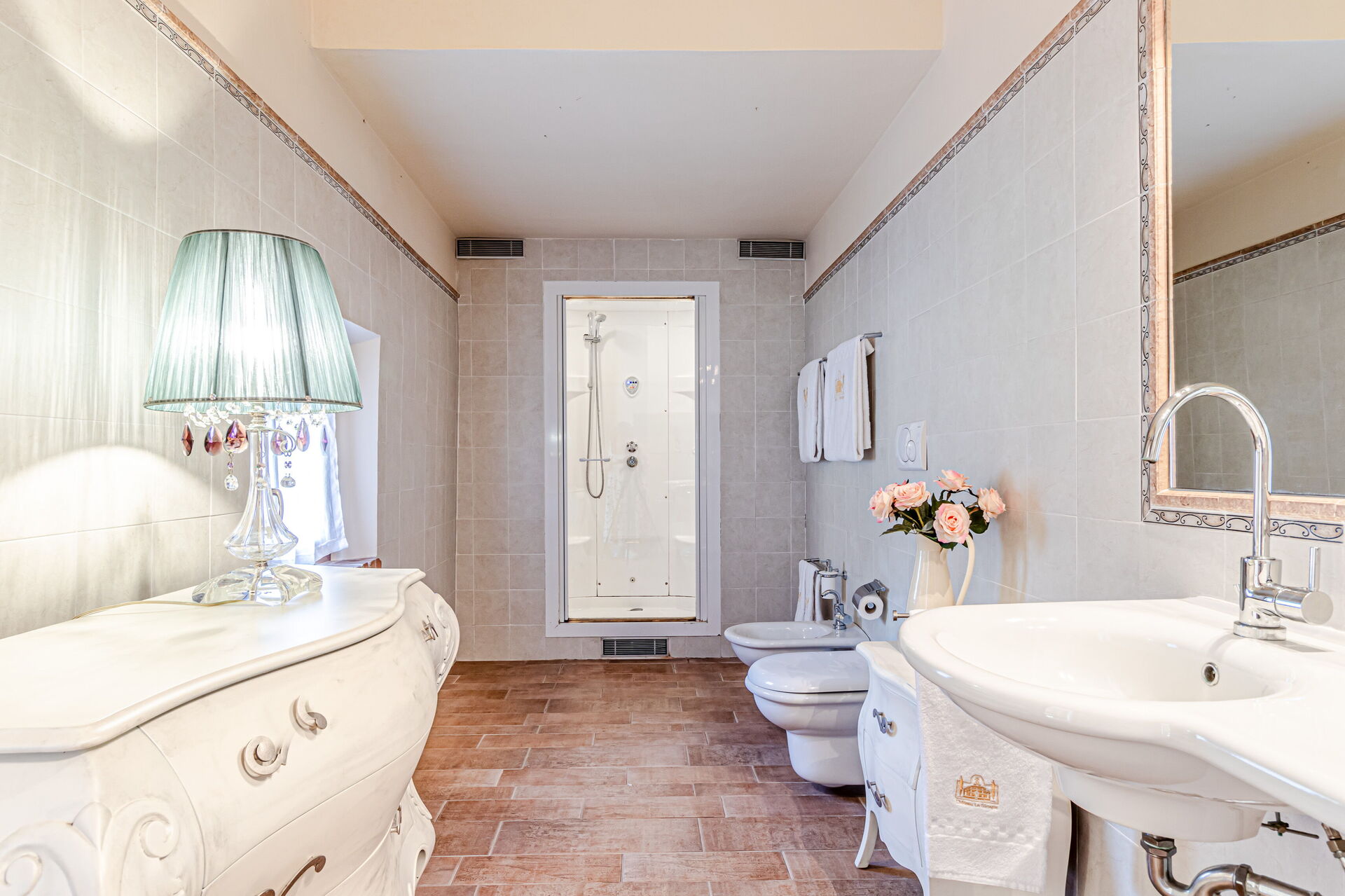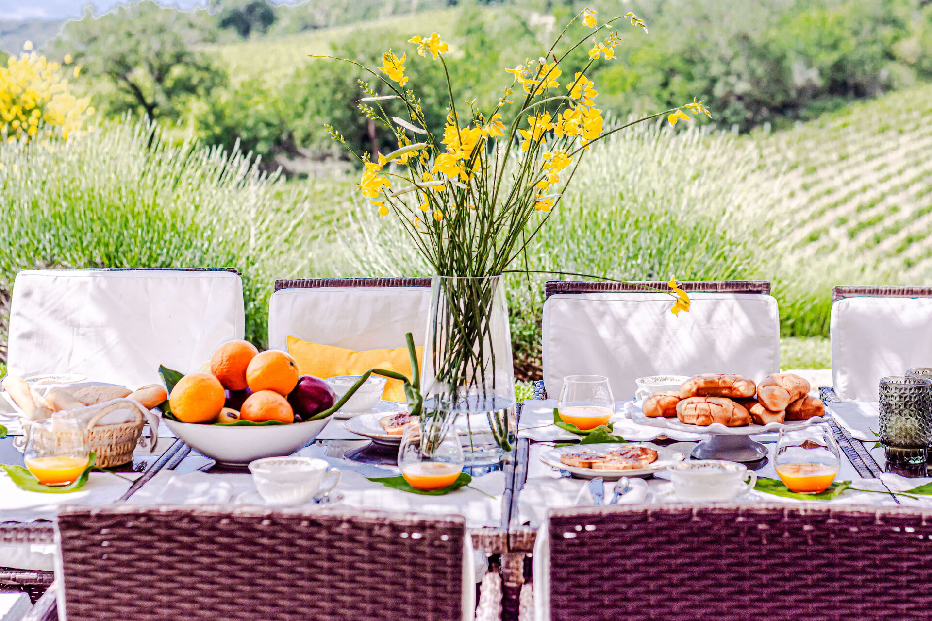 Ejendommens udendørsarealer strækker sig over det storslåede gods og giver dig mulighed for at fordybe dig i den naturlige skønhed i det toskanske landskab. Du kan spadsere gennem de omfattende grunde prydet med vingårde, der i øjeblikket producerer cirka 300 quintals druer årligt, vandre blandt olivenlundene eller udforske skovområderne, der giver skygge og sindsro. Den ekspansive gård tilbyder rigelig plads til udendørsaktiviteter og afslapning, mens det omkringliggende landskab præsenterer betagende udsigter over de bølgende bakker, der karakteriserer denne berømte region.