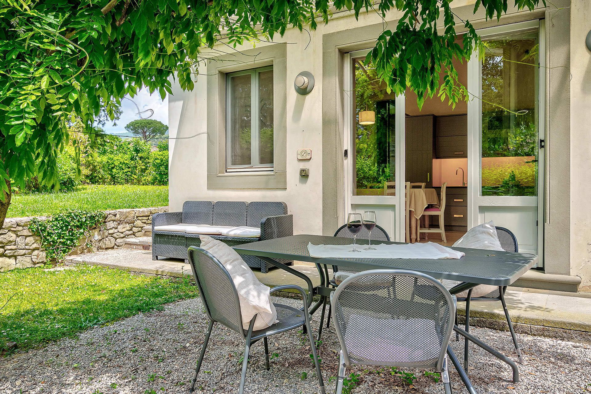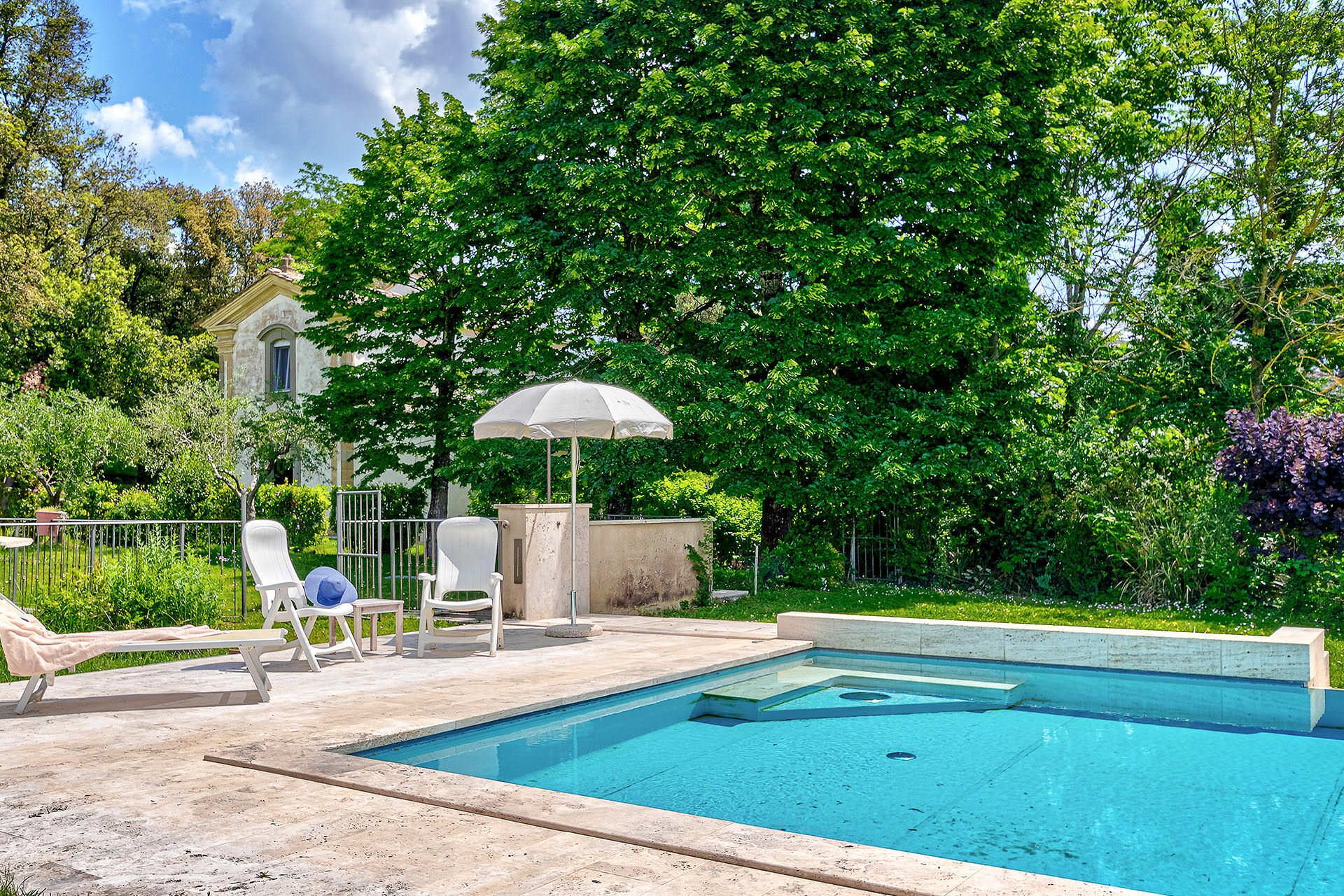 Haven omkring villaen er en privat, indhegnet område på 1.200 kvadratmeter. I haven ligger en privat svømmepøl udstyret med solsenge og parasoller. Udendørs møbler, herunder bord og stole, er placeret rundt omkring haven og skaber rammer for spisning og samvær under åben himmel.