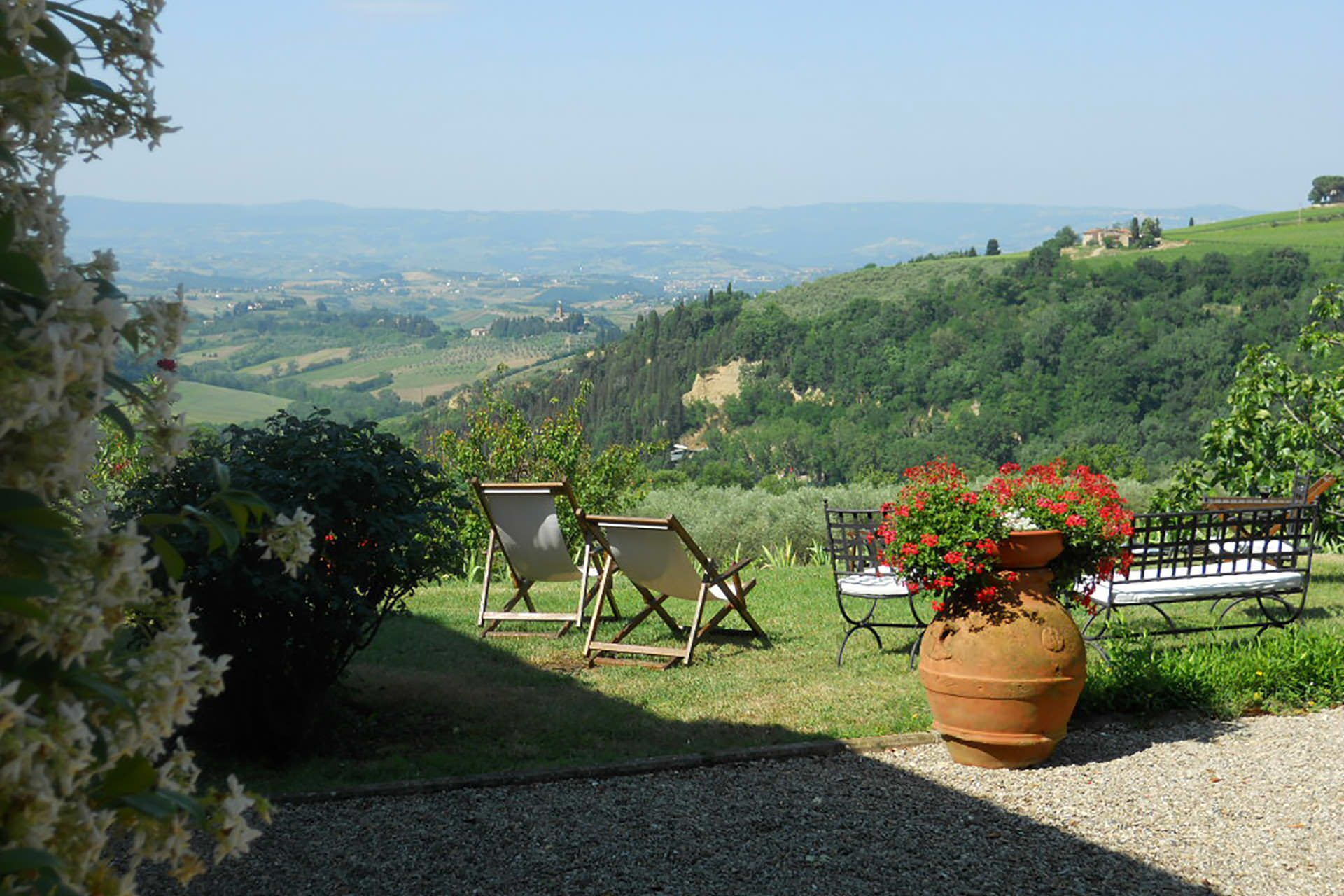 Haven er stor og privat med en svømmepøl på 5 x 10 meter, udstyret med solstole og parasoller. En overdækket terrasse tilbyder skygge i varmen, og flere siddepladser med borde og stole er spredt rundt i haven med udsigt til San Gimignano. En overdækket loggia egner sig til spisning under åben himmel, og der er en barbecue til rådighed. En pergola udgør yderligere et opholdssted i det fri.
