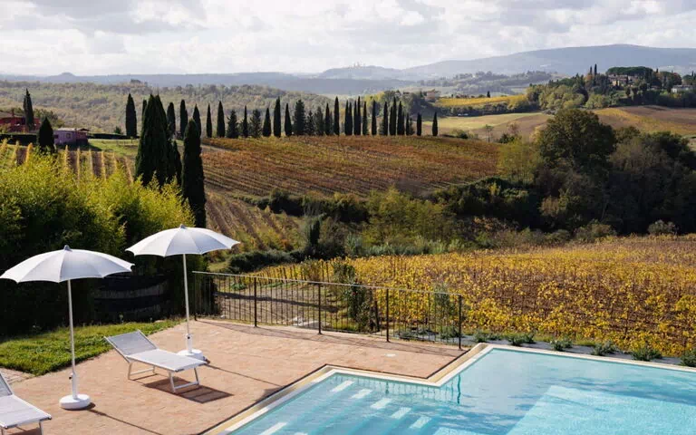 "Podere Galieni", 8-værelse-feriehytte 250 m2 på 3 etager. Rummelig og lys, fuldstændig renoveret i år 2025, meget komfortabelt og smagfuld indrettet: stue/spisestue med spisebord og køkkenblok. Udgang til have. Stor spisestue med panoramavindue med klimaanlæg. Udgang til terrasse, til pool. 1 værelse med 1 seng (80 cm, længde 200 cm), 1 dobbeltseng, brus/bidet/WC og TV (fladskærms TV), klimaanlæg. Køkken (ovn, opvaskemaskine, Brødrister, kedel, mikroovn, elektrisk kaffemaskine). Særskilt toilet. Nederste etage: 2 brus/WC. Overetage: (udvendig trappe) 2 dobbeltværelse, alle værelser med brus/bidet/WC og TV (fladskærms TV), klimaanlæg. 1 værelse med 1 seng (80 cm, længde 200 cm), 1 dobbeltseng, brus/bidet/WC og TV (fladskærms TV), klimaanlæg. Udgang til terrasse. 2 værelse, alle værelser med 1 seng (80 cm, længde 200 cm), 1 dobbeltseng, brus/bidet/WC og TV (fladskærms TV), klimaanlæg. Opvarming, klimaanlæg. Stor terrasse overdækket, havesiddeplads. Havemøbler, liggestole, opbevaringsrum. Meget flotte panoramaudsigt over landskabet og San Gimignano. Til benyttelse: vaskemaskine, strygejern myggenet højstol, barneseng til 2 år, hårtørrer. Internet (trådløs LAN [WLAN], gratis). Parkeringsplads ved huset. Bemærk venligst: ikke-ryger lejlighed. Brandalarm, brandslukker. Ingen intern forbindelsesdør mellem de adskilte boliger. Ingen intern dør mellem etager. Fælles pool er tilgængelig til udelukkende brug.