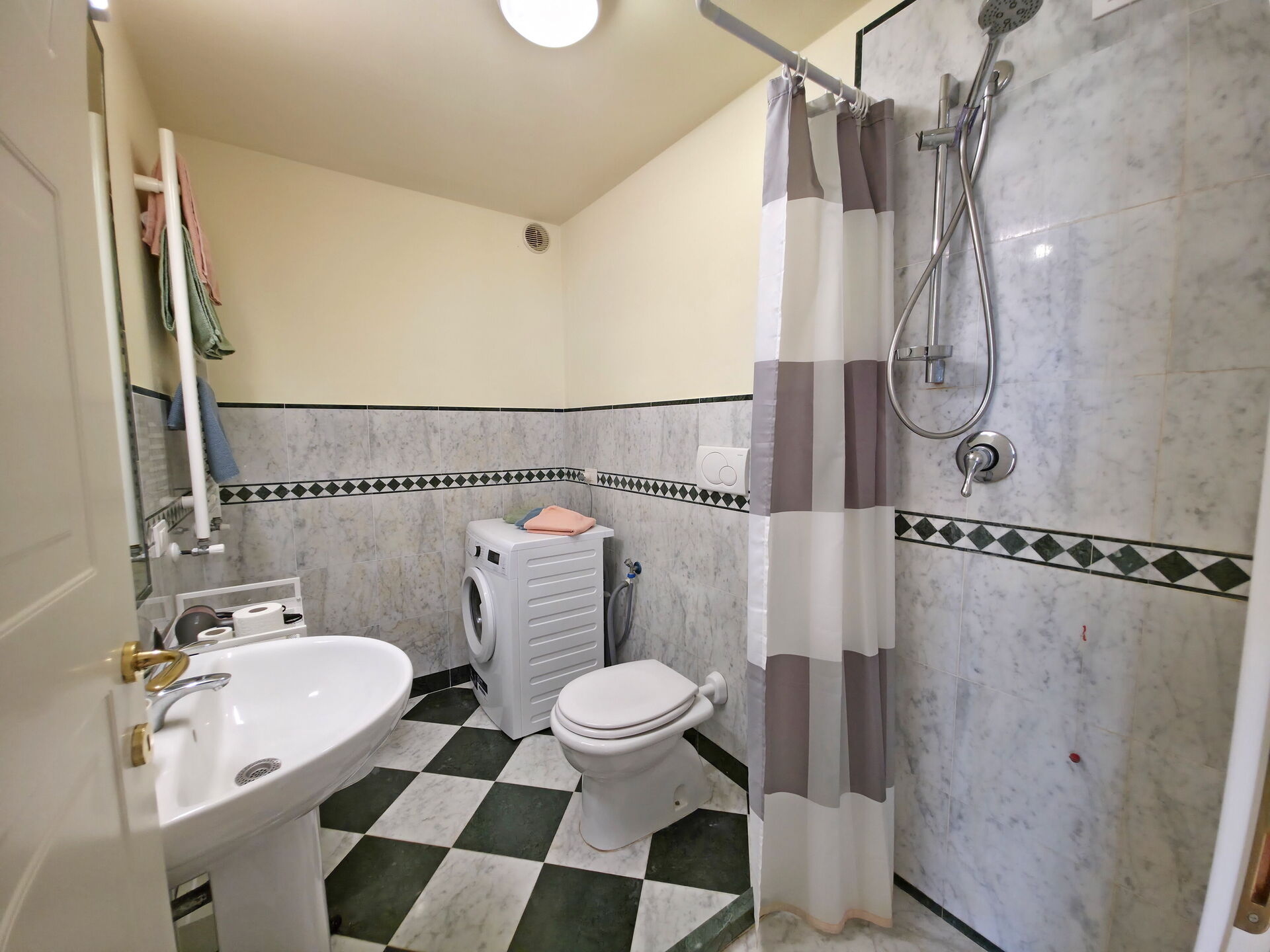 - Bathroom with shower, toilet, bidet, sink, and washing machine.