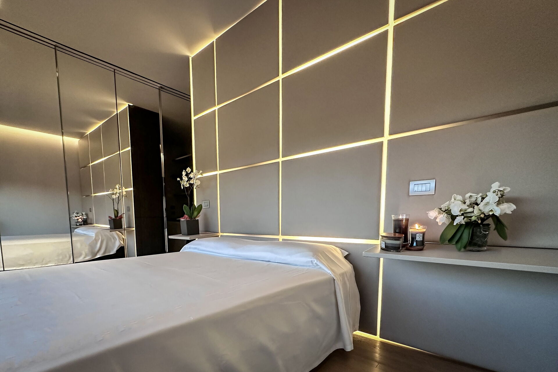 Soveværelse med bad 1: dobbeltseng, WIFI internet, klimaanlæg, vask, wc, bidet, bruser.