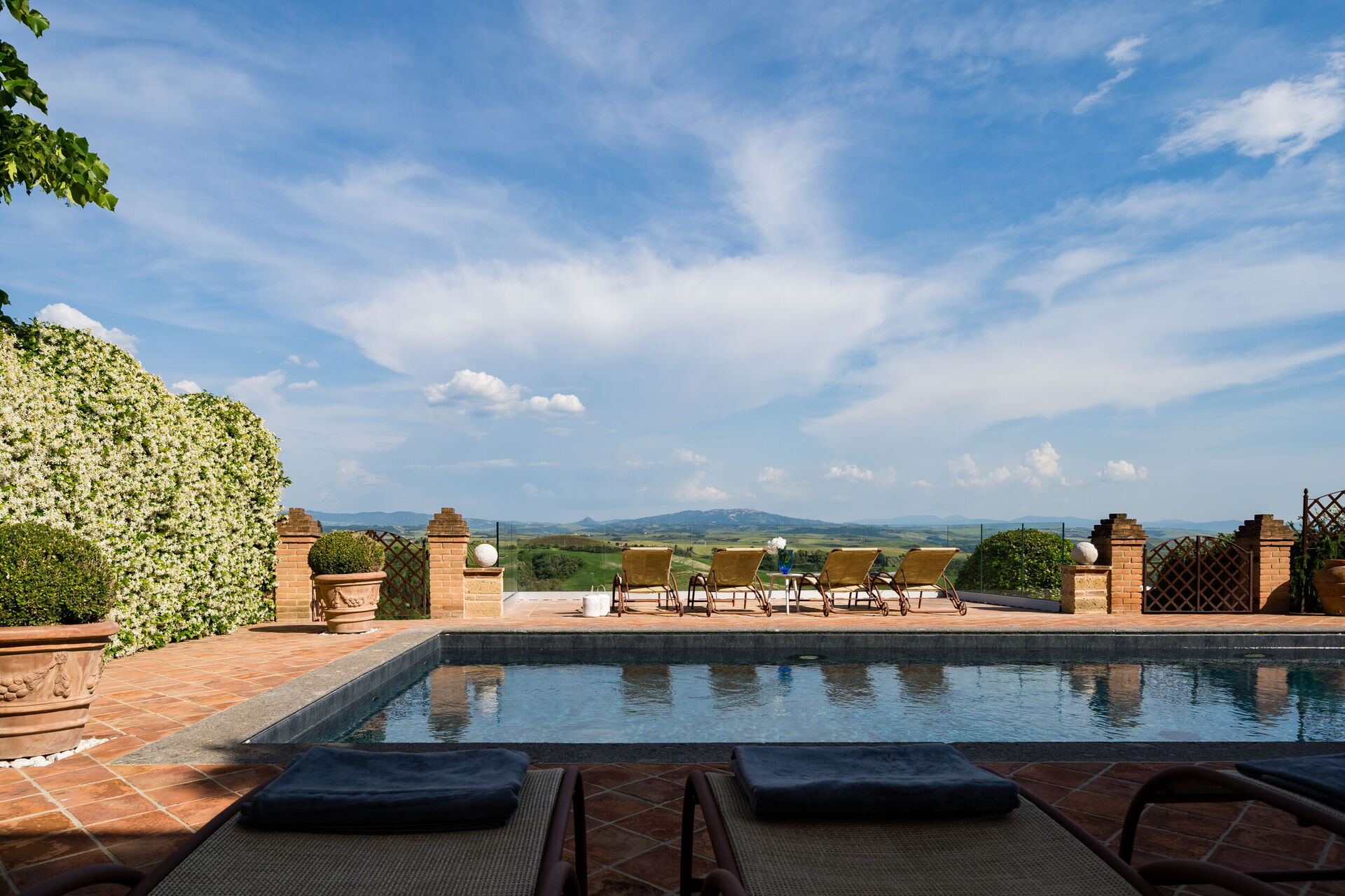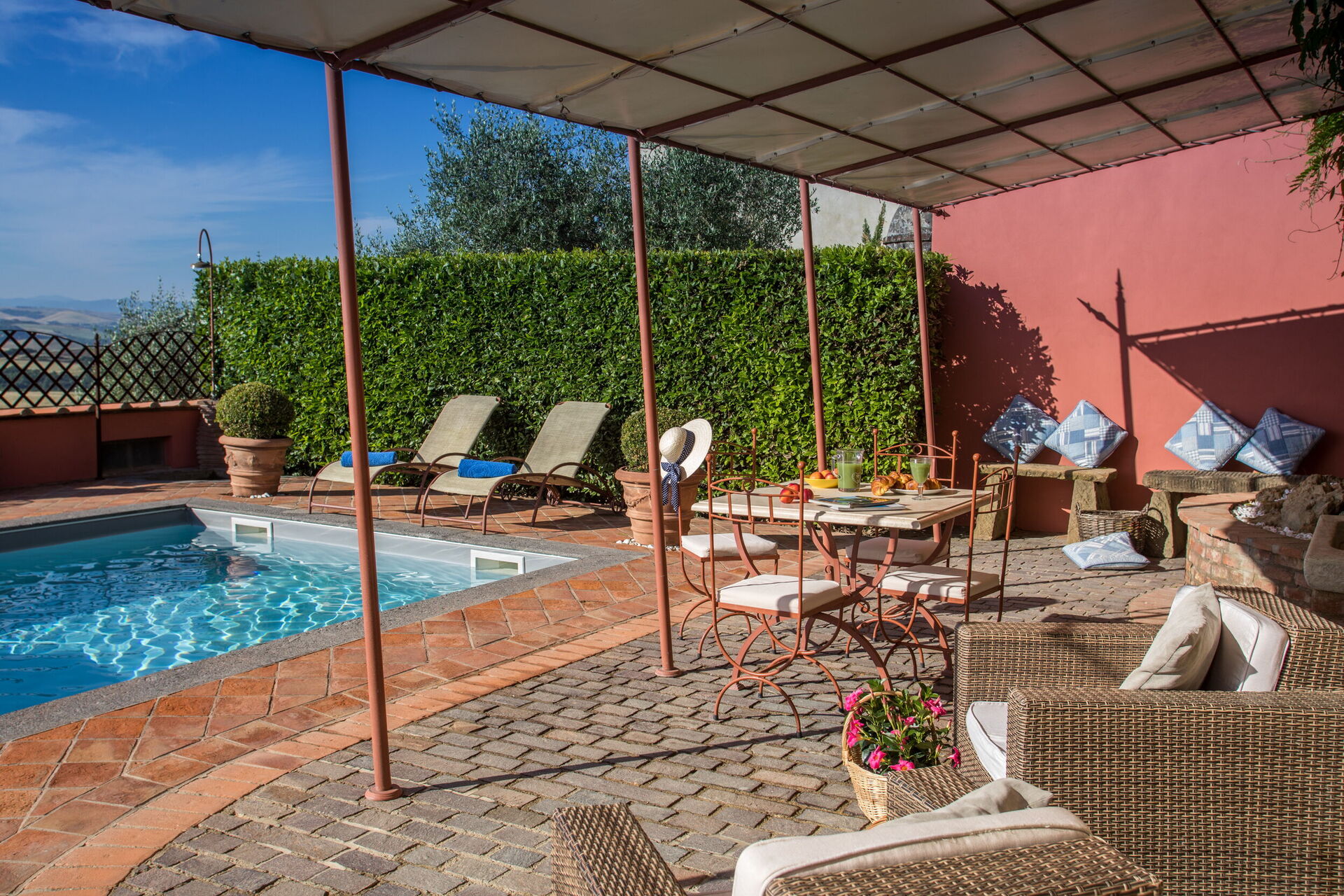 Ved ankomst vil I møde en dejlig ren velholdt ejendom med udsigt over bakkerne perfekt til afslappende ferie i Toscana. Efter en hektisk dag med shopping, er det dejligt at nyde lidt tid med venner og familie ved kanten af poolen med et glas vin - det er en perfekt måde at køle ned på sidst på dagen. Udendørs vil I også finde boblebad, gårdhave og barbecue.