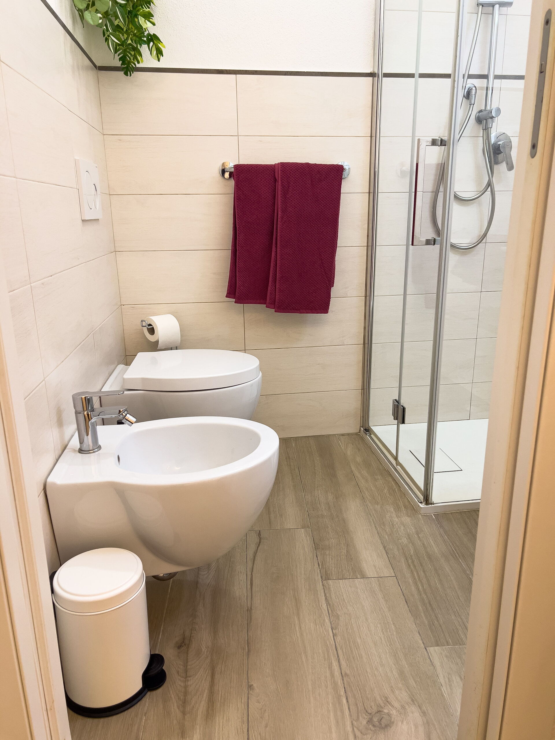 Badeværelse med bruser, toilet, bidet, håndvask, hårtørrer.