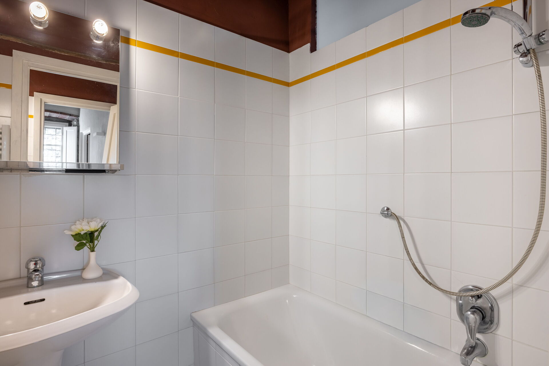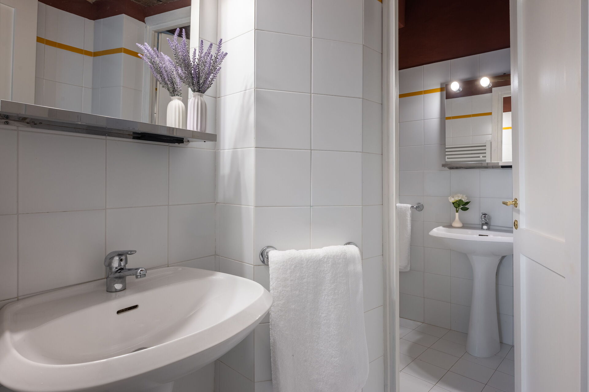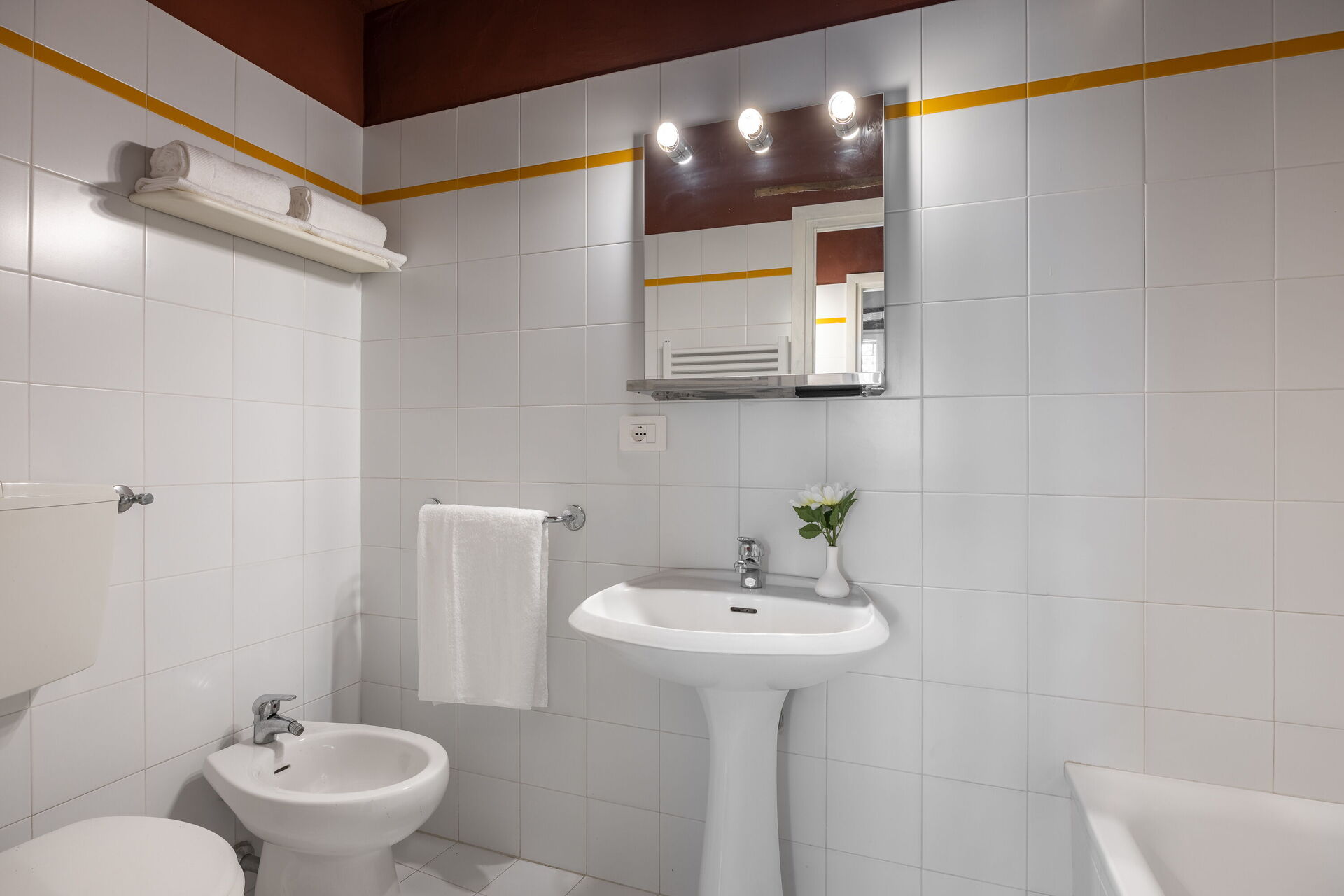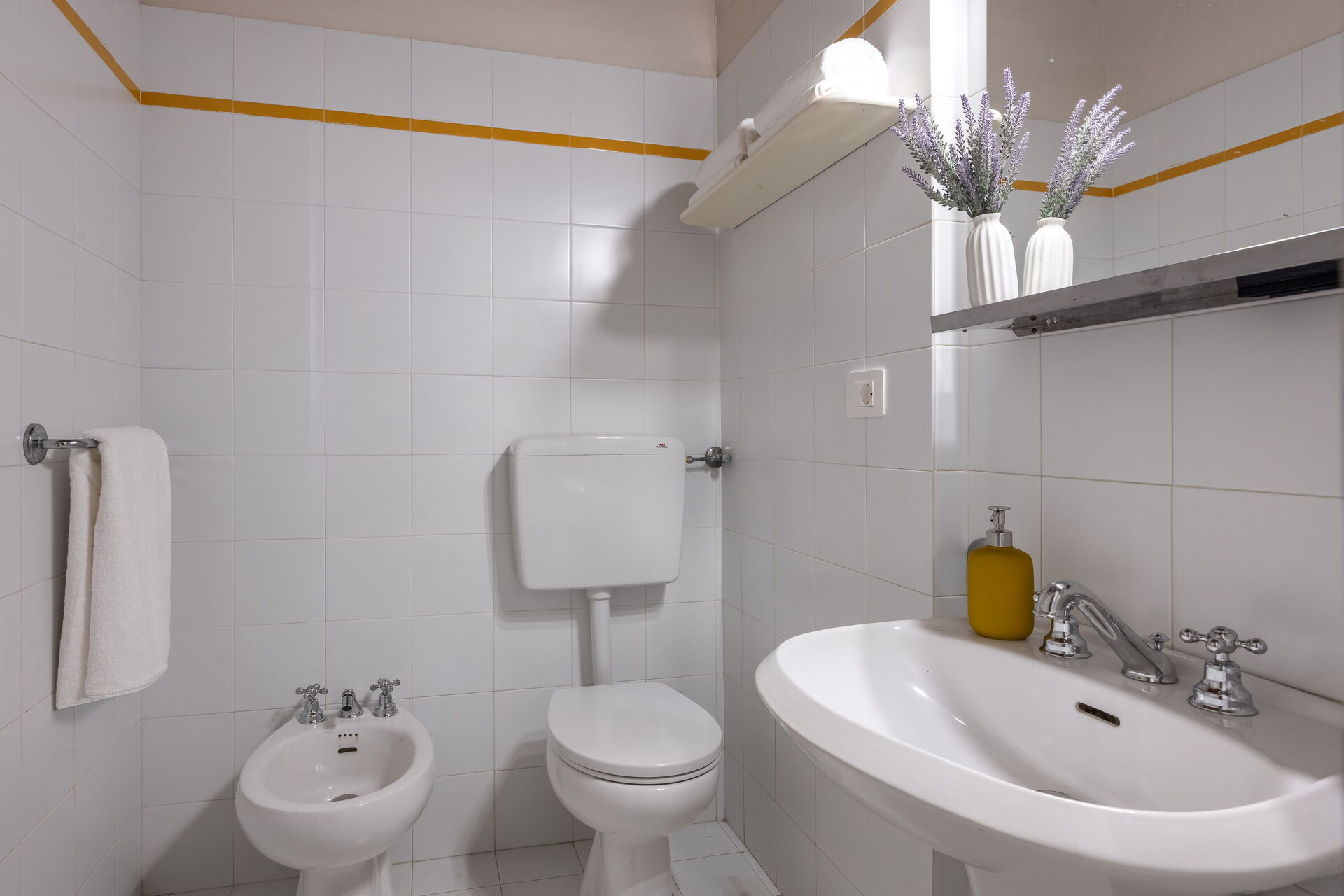 Badeværelse: vask, wc, bidet, badekar, hårtørrer.
