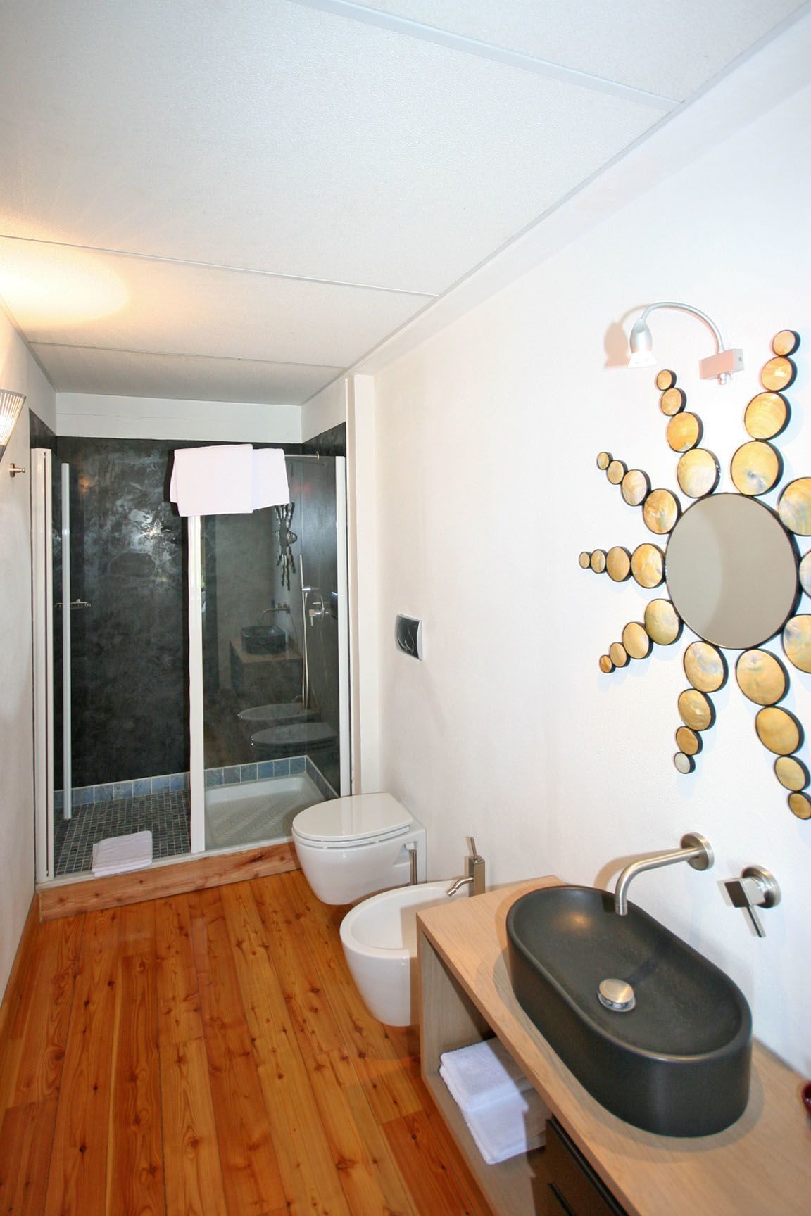 1st floor: elegant and bright suite with kitchen corner (oven, freezer), dining area, living area (TV) and double bed, bathroom with shower.