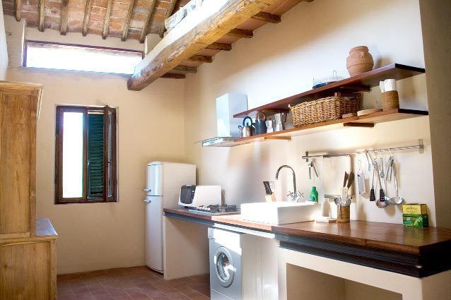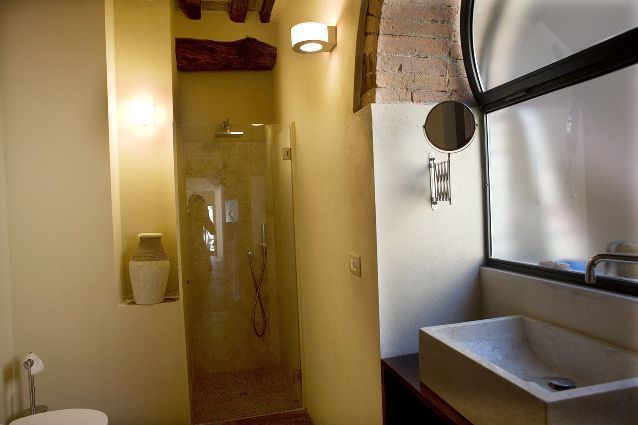 The living room has large openings and a dining table for 6/8 persons. The separate kitchen area is spacious and modern, with dishwasher, washing machine, large fridge and gas cooker, and microwave oven. Two double rooms share a bathroom with shower, stone basin and travertine cladding. Stylish teak furniture and wrought iron bedsteads. Central heating.