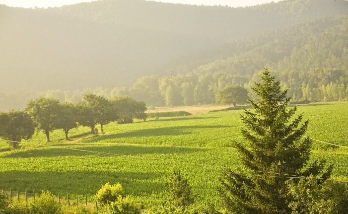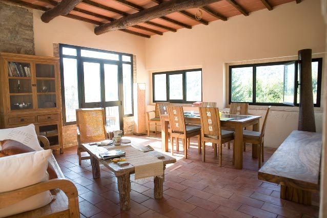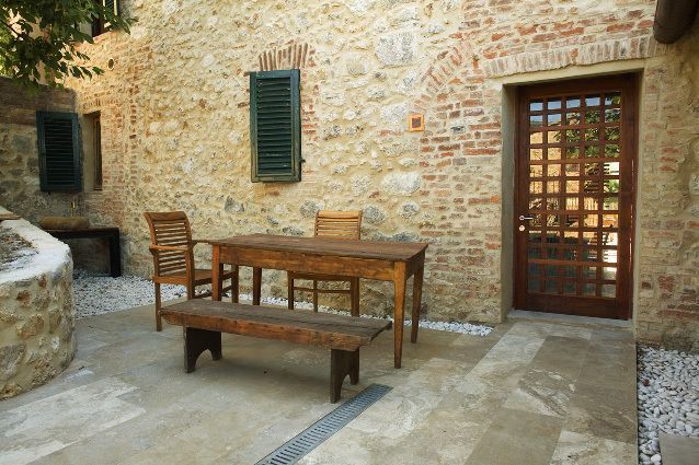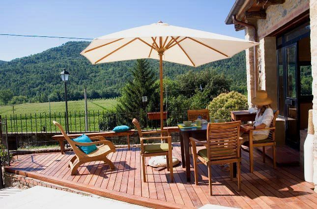 Located on the ground floor, it has a terrace with a wooden teak deck to dine outside facing the fields.