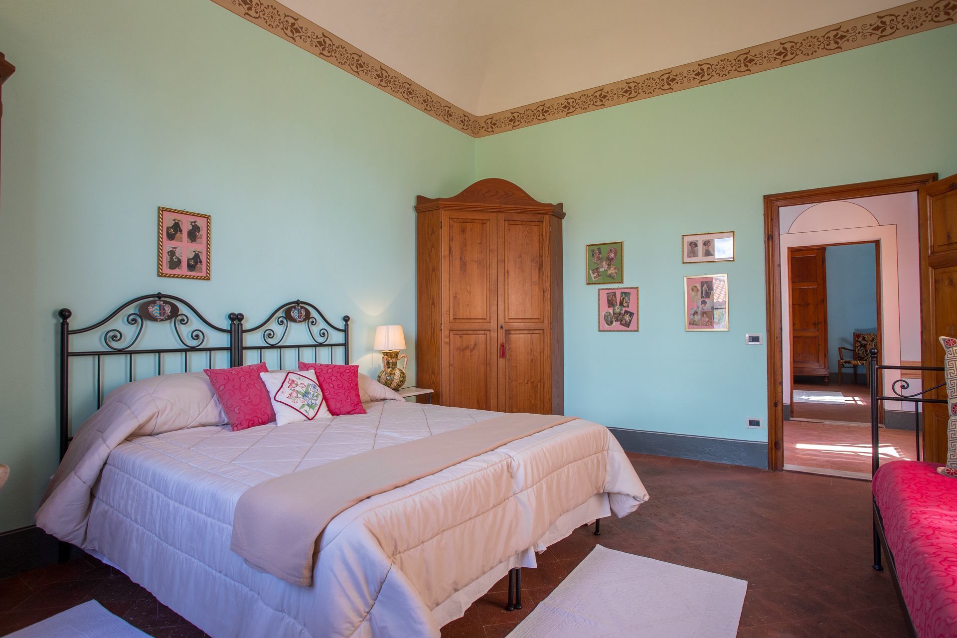 Første sal: soveværelse med dobbeltseng, soveværelse med dobbeltseng med baldaquin seng, 2 dobbeltværelser (som kan omdannes til dobbeltværelser efter anmodning), badeværelse med bruser, badeværelse med bruseniche og badekar.