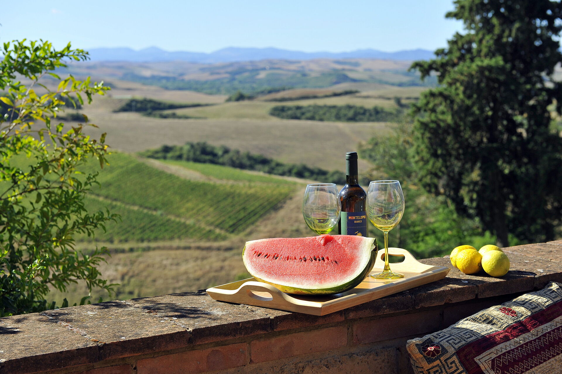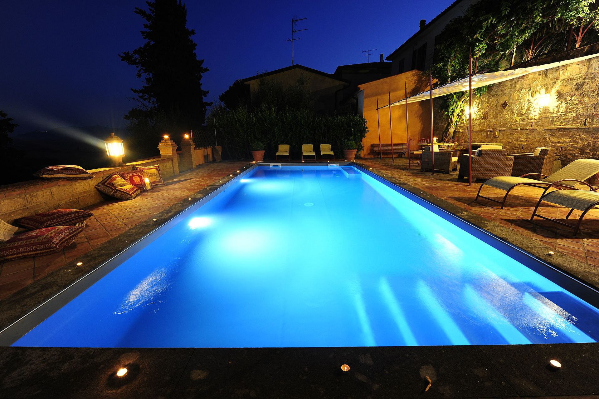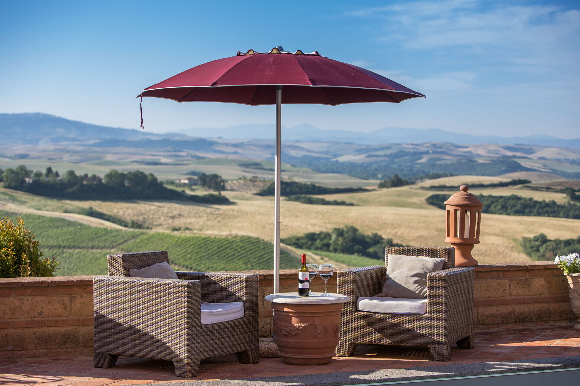 Villaen har en charmerende terrasse (tilgængelig fra køkkenet) med panoramaudsigt udstyret med bord og stole til spisning under åben himmel. På et lavere niveau er der en smuk privat pool med udsigt over dalen nedenfor.