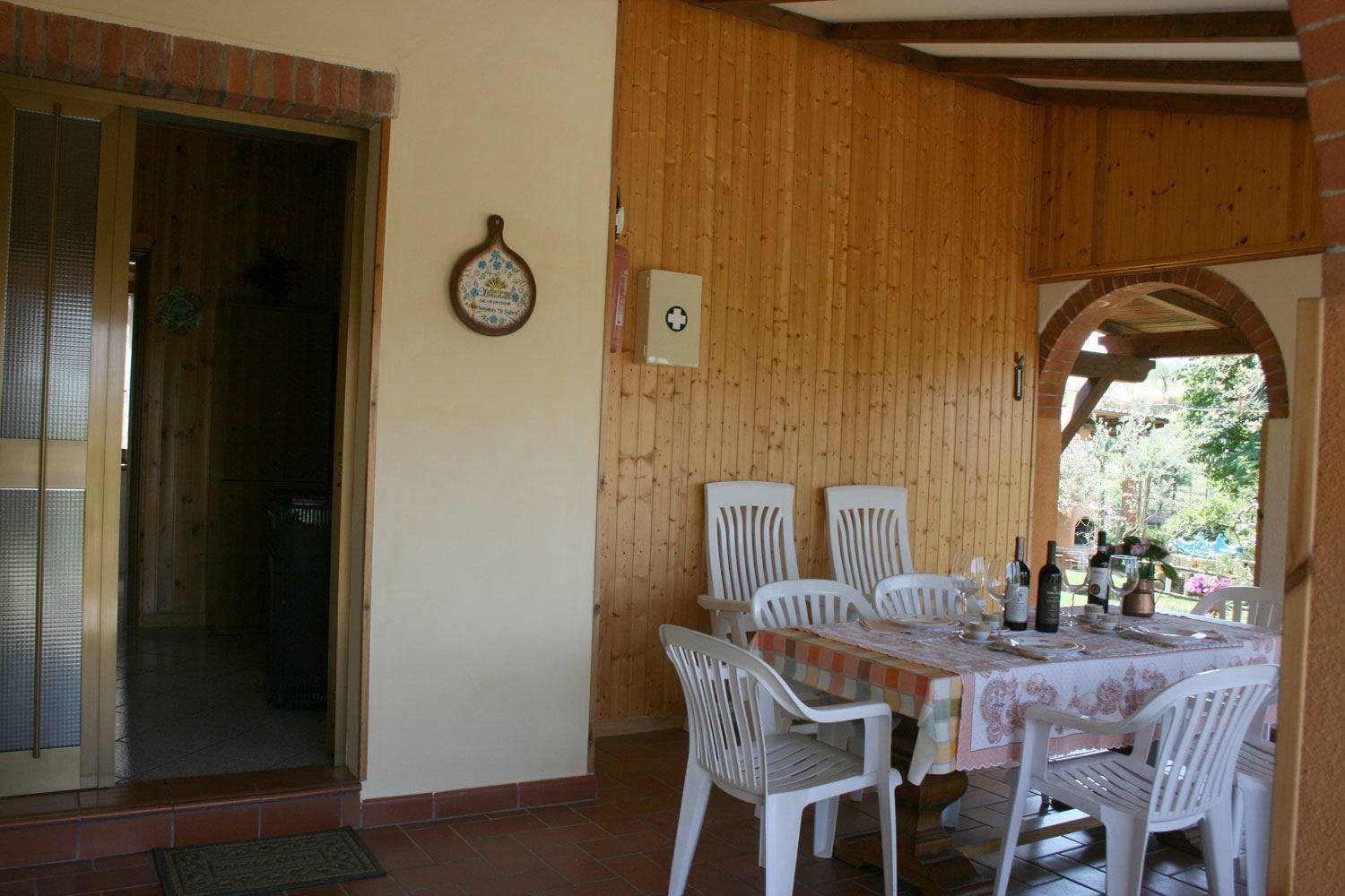 Ground floor apartment comprising living-dining room with kitchenette, fireplace and double sofa bed, double bedroom, twin bedroom, bathroom with shower. Large portico equipped with table and chairs. Private garden (approx. 40 sqm).