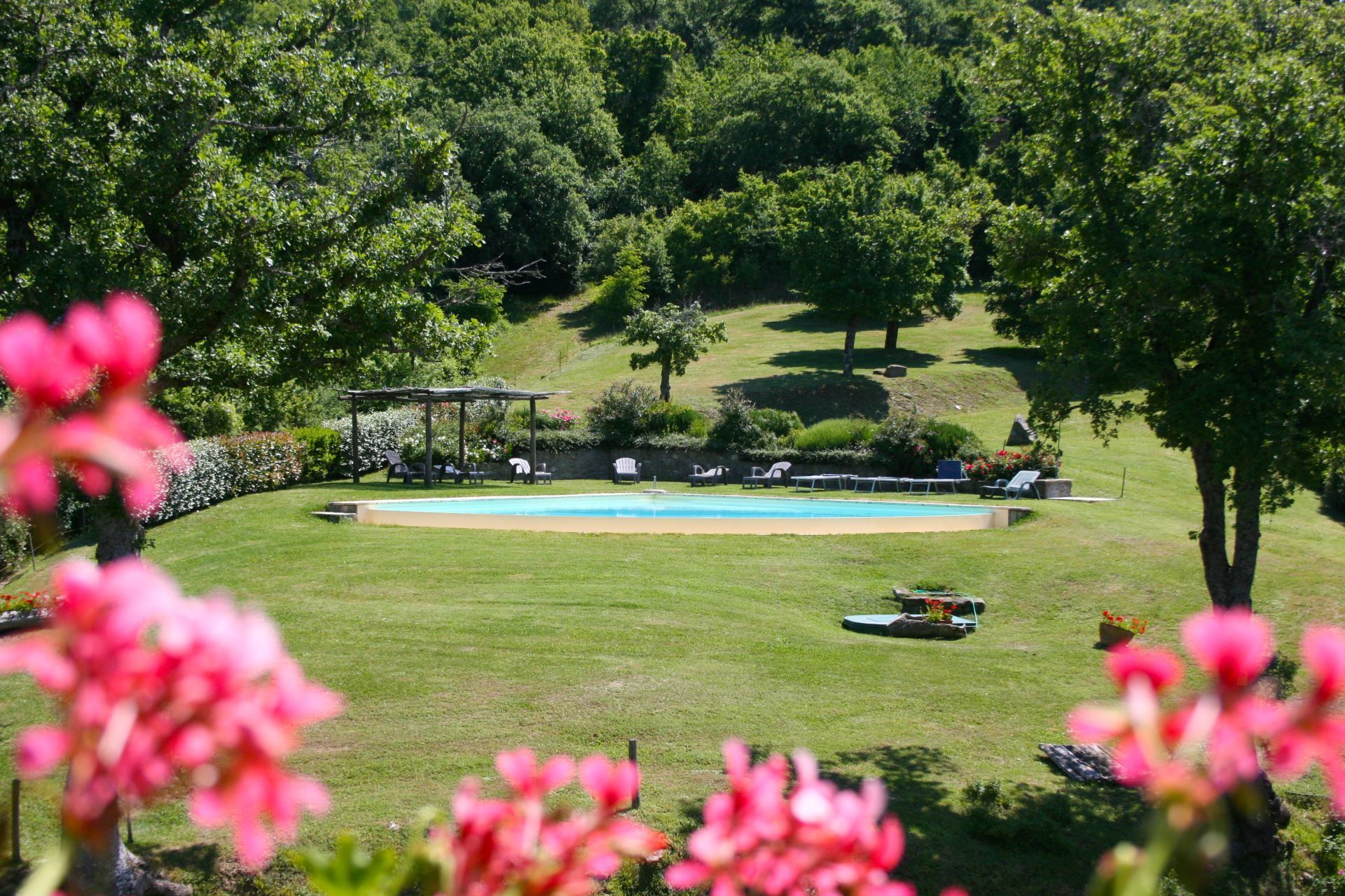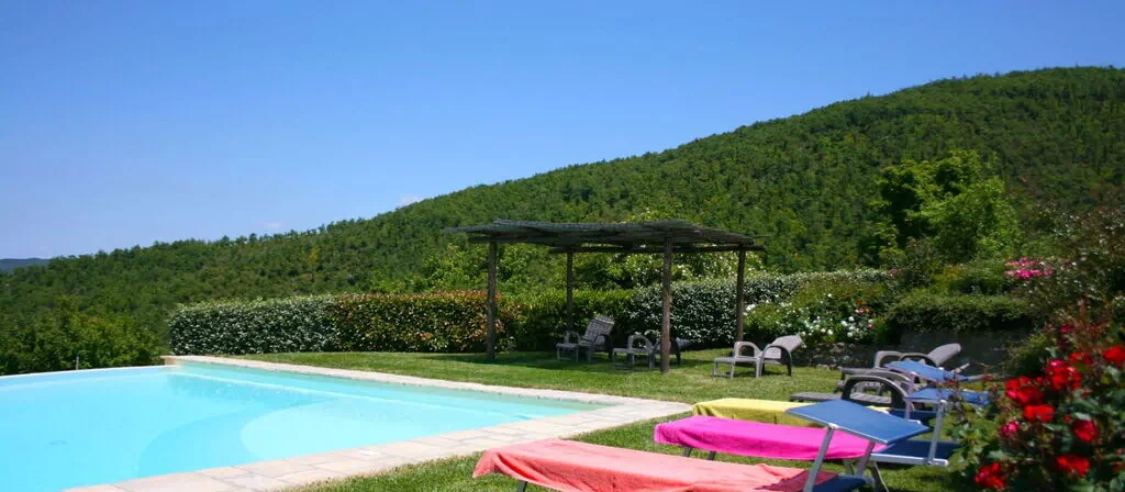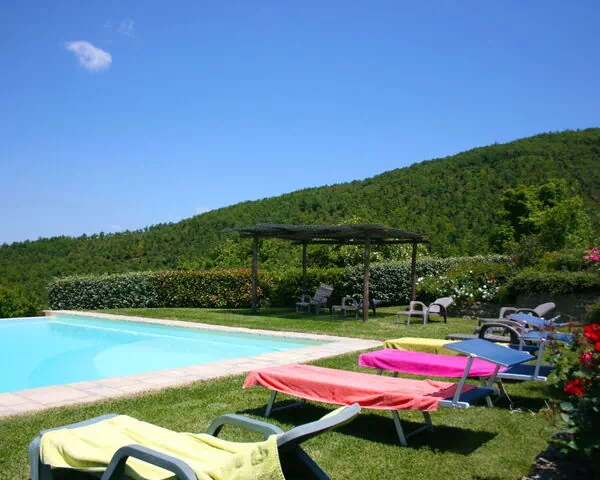 At the edge of the garden, on a terrace in a dominant position with respect to the house and the valley below, you will find the beautiful swimming pool (size 9x9 m - depth 1.20-2.20 m - open from 01st May to 30th September), equipped with sunbeds and a wooden gazebo, if you prefer to enjoy it sheltered from the hot summer sun.
