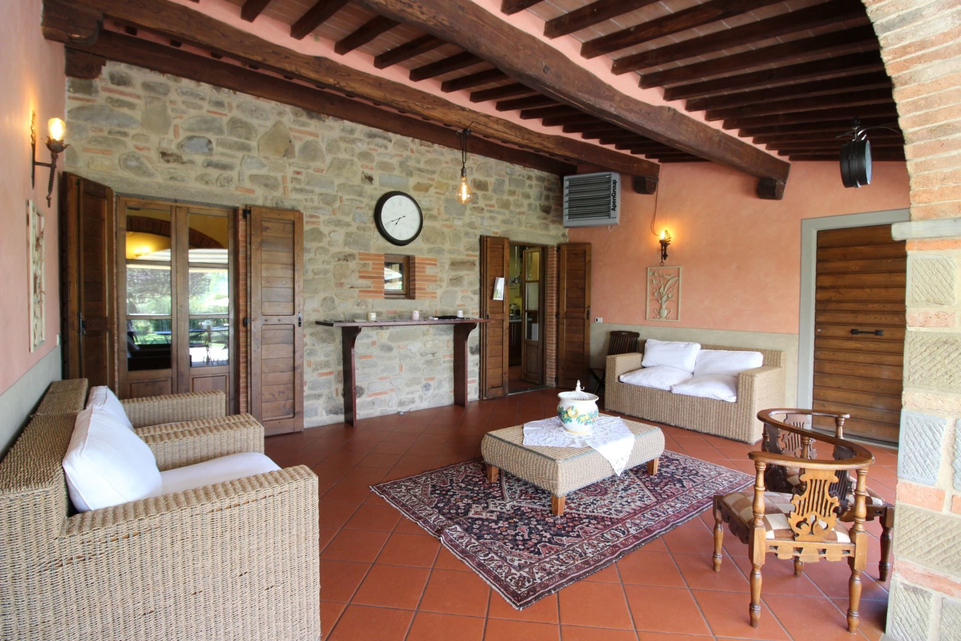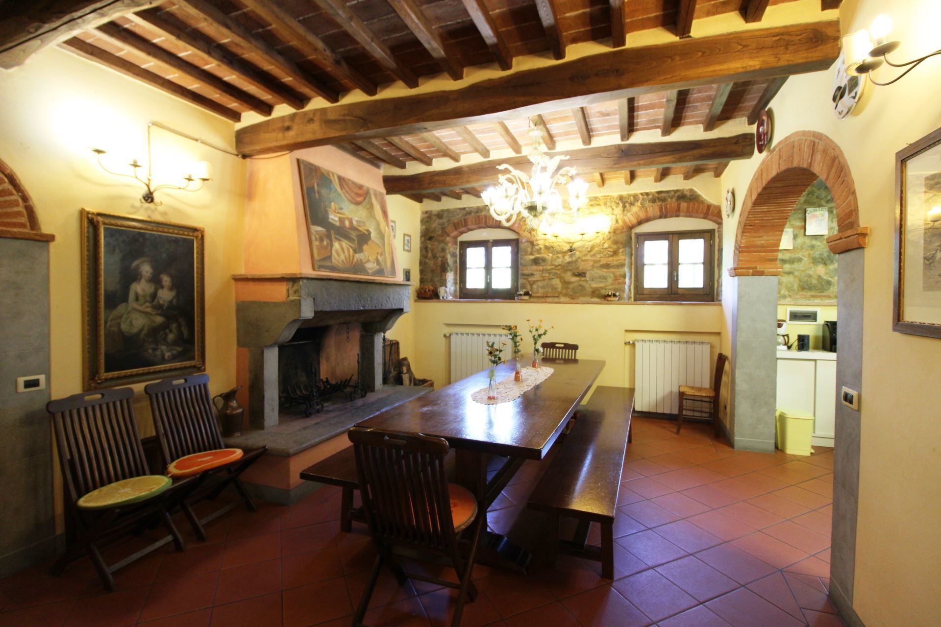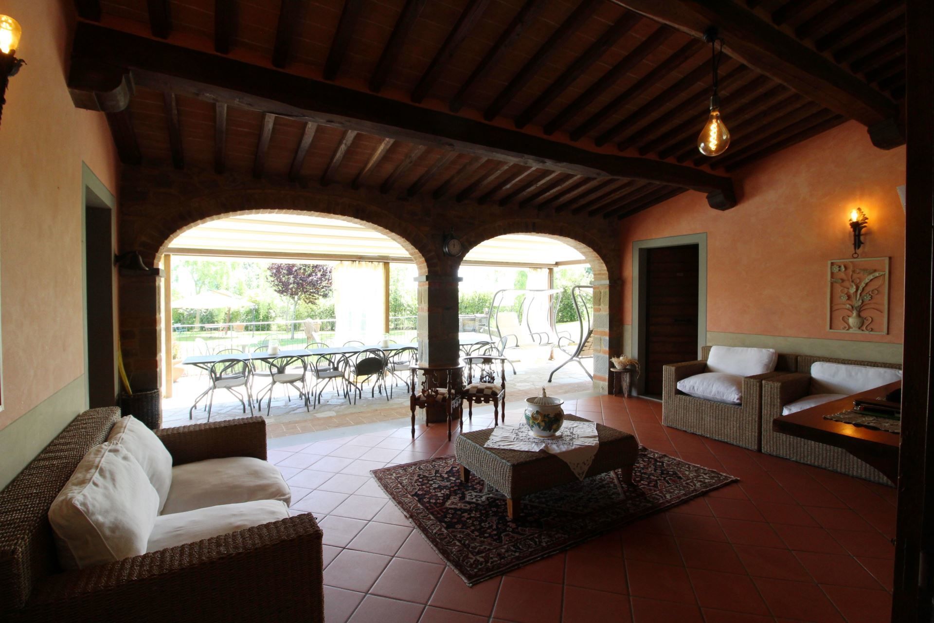 The villa is located at the foot of the first wooded hills, which mark the border between Valdichiana and Valdarno, from here you can make even daily excursions, towards the two valleys, dotted with small villages nestled in the Tuscan countryside. In Monte San Savino, which is just a few kilometres away, it will be pleasant to spend evenings out, dining in typical restaurants or enjoying an aperitif sitting at tables in the colourful cobbled streets.