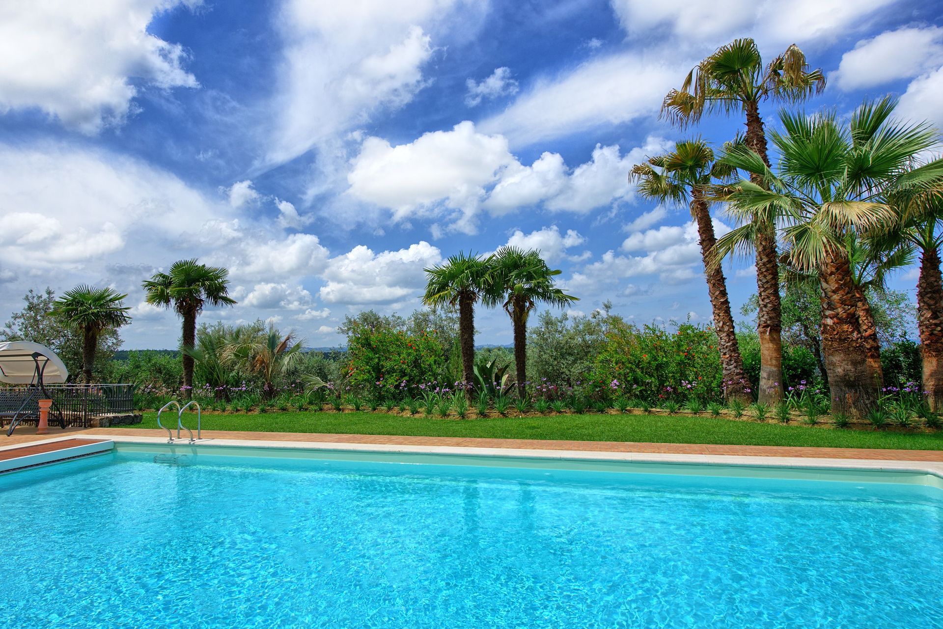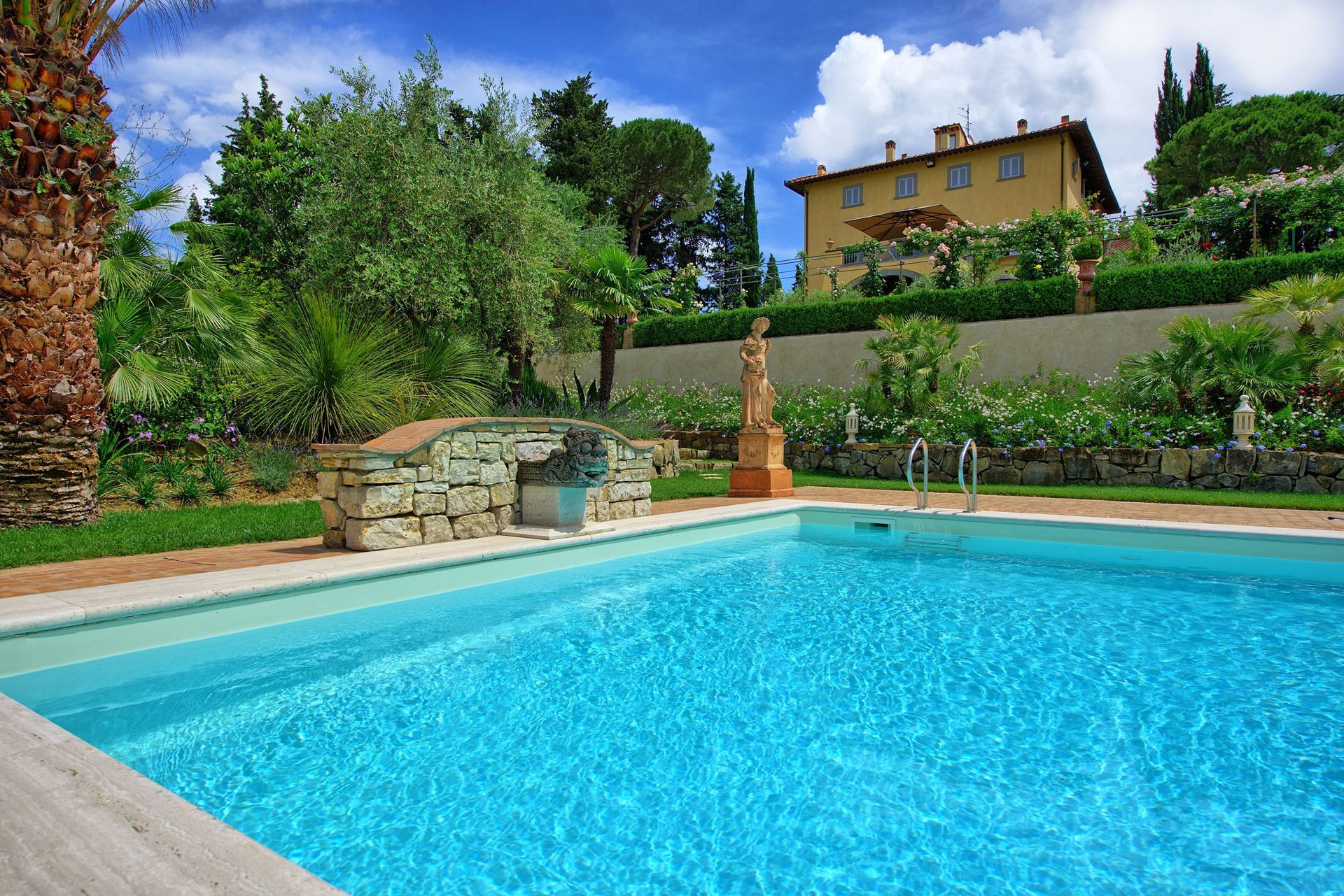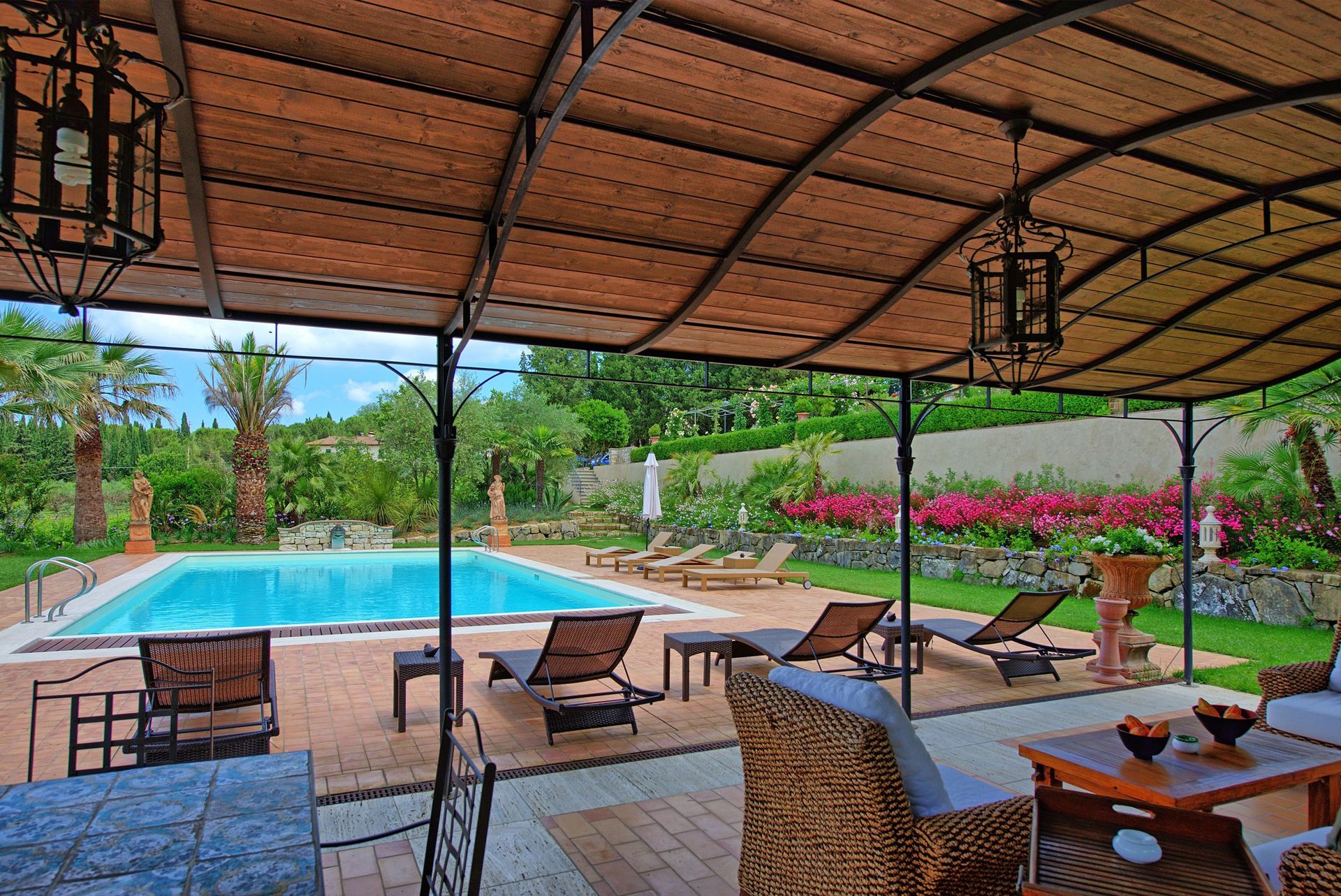 At guests disposal: large well-stocked garden, swimming-pool (12,9 x 7 m – max. depth 1,5 m – open from 01/05 to 30/09), open-air shower, toilet and dressing-room, gazebo, and sun beds. All of the 2 apartments provide a share of a covered furnished terrace ideal for al-fresco dining with nice views over the owners Italian garden. Parking within the grounds.