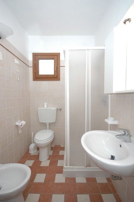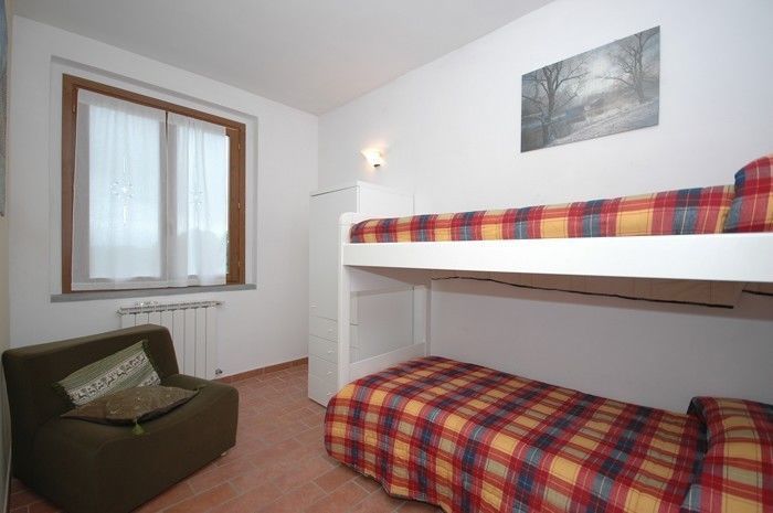 Ground floor: living room (satellite TV) with dining table and kitchen corner (freezer, 140 lt refrigerator), double bedroom, bedroom with bunkbed, bathroom with shower.