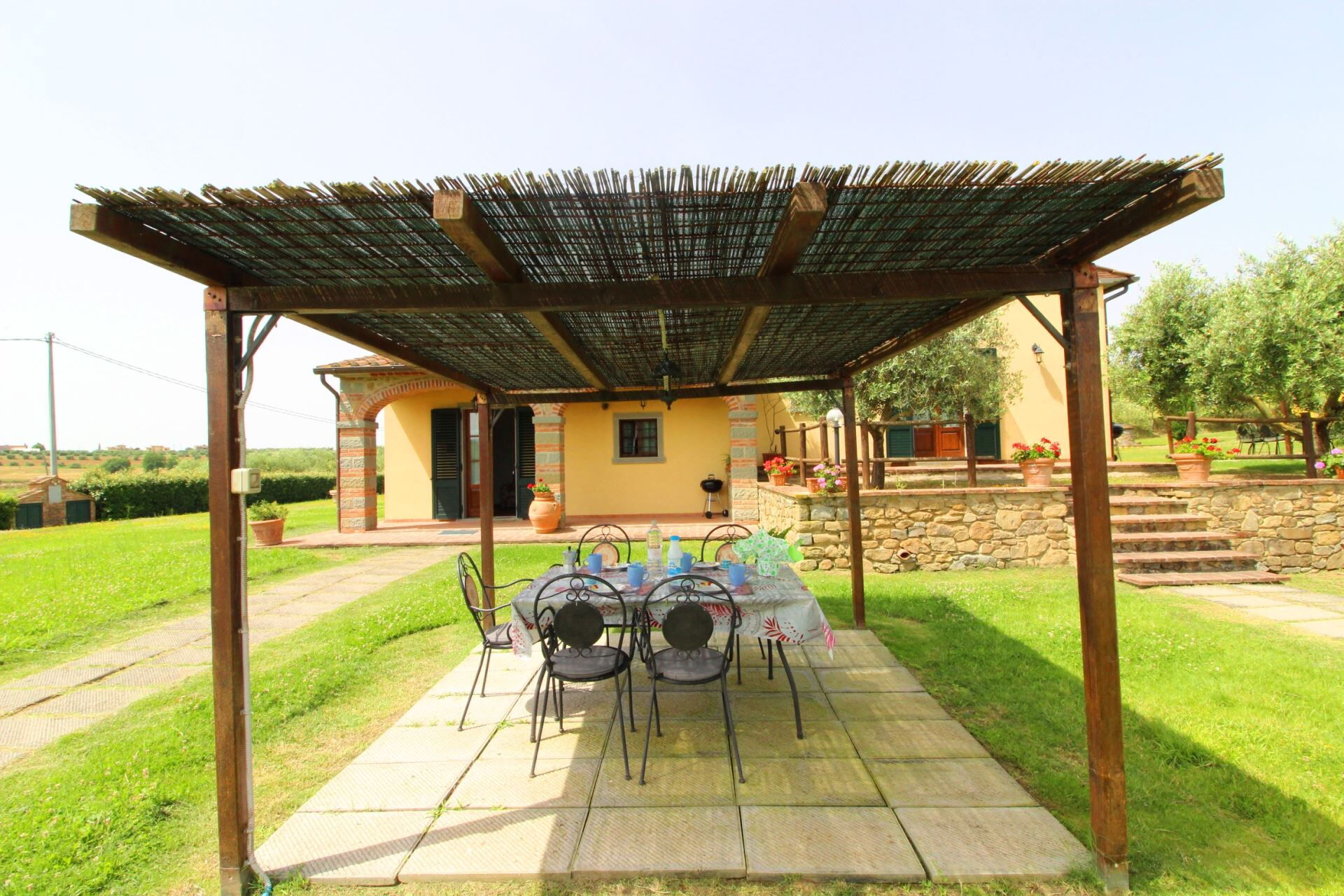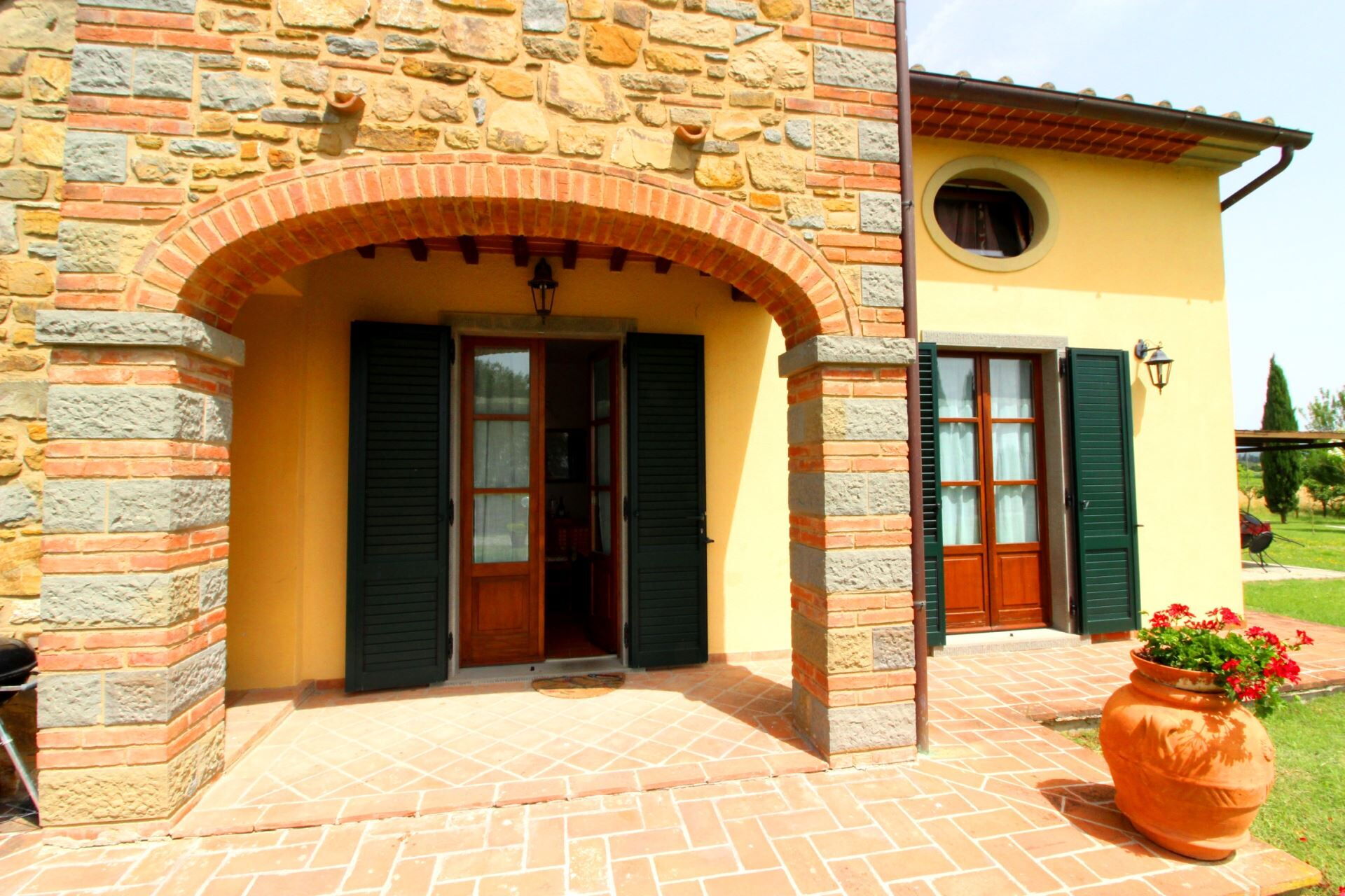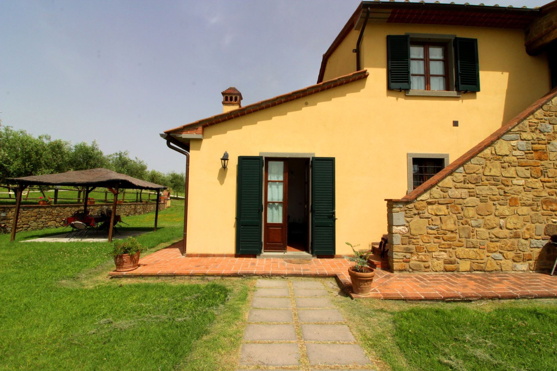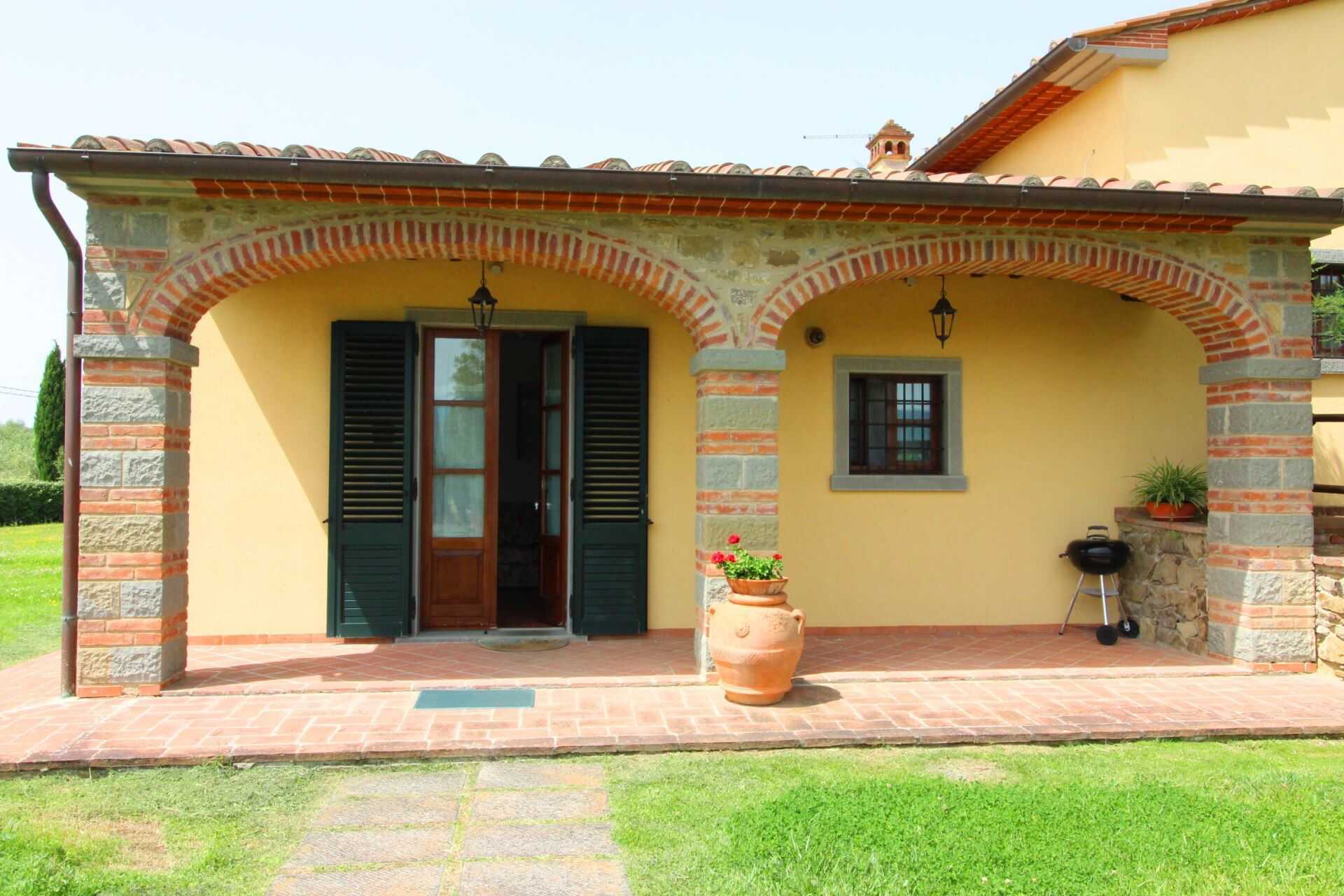 Ground floor apartment with entrance through private porch composed of living-dining room with kitchen corner, bathroom with shower, two double bedrooms one of which with French window overlooking the garden. Gazebo furnished with table and chairs to eat outside.