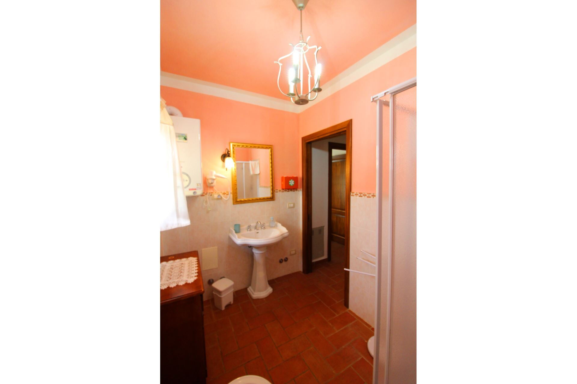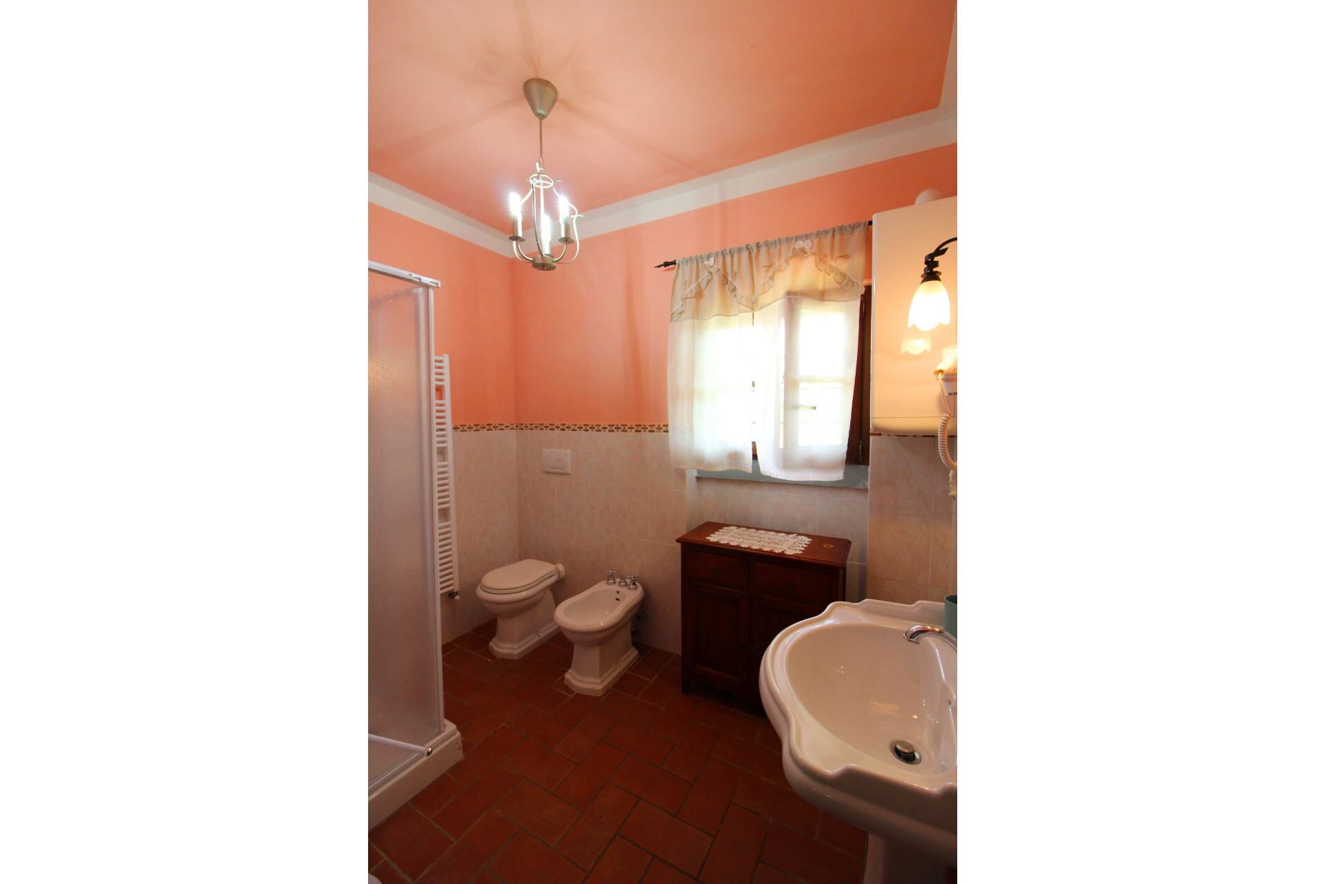 The shower cubicle in the sufficiently large bathroom needs to be replaced.