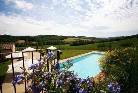 Patio with garden furniture and beautiful view of swimming pool and surrounding hills.