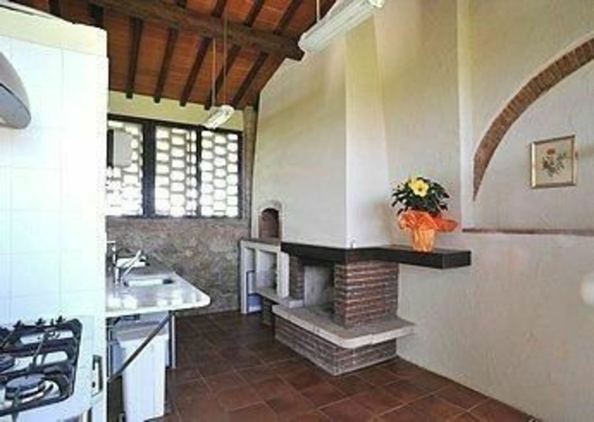 Ground Floor: sitting room with Sat-TV. DVD player with USB connection, WC with n.2 sinks. Small reading room. Five steps leading to two master bedrooms with an ensuite bathroom with shower. Professional well equipped kitchen (oven, slicer, 6 burners, coffee-maker, toaster). Two steps leading to the dining room equipped with table for 14 people.