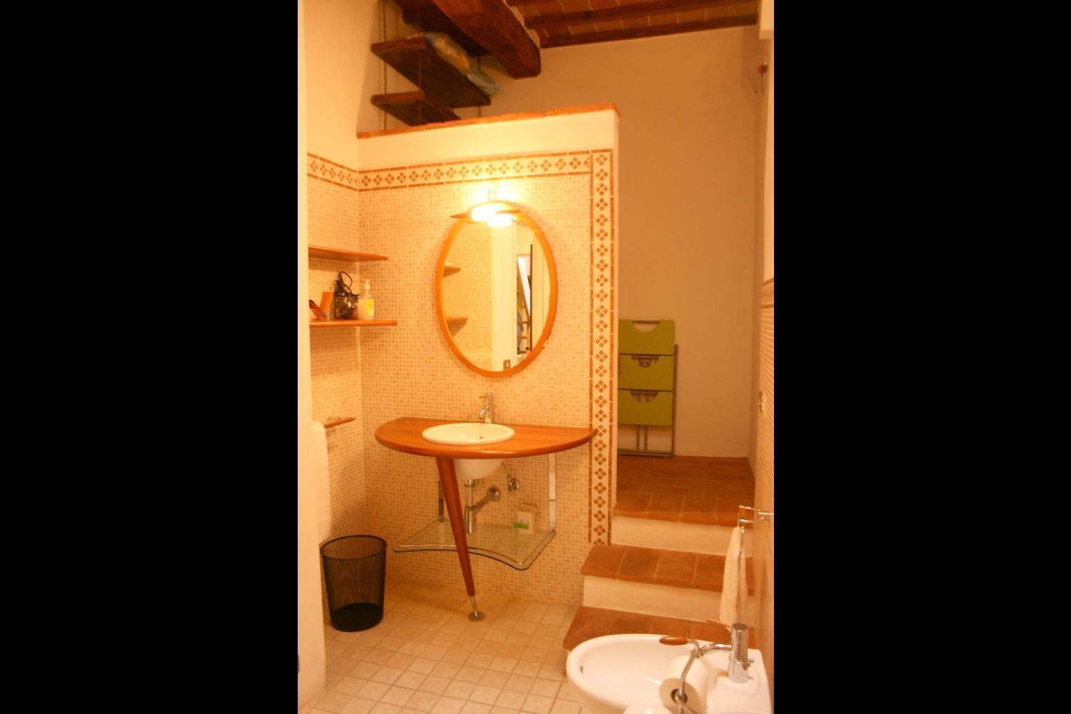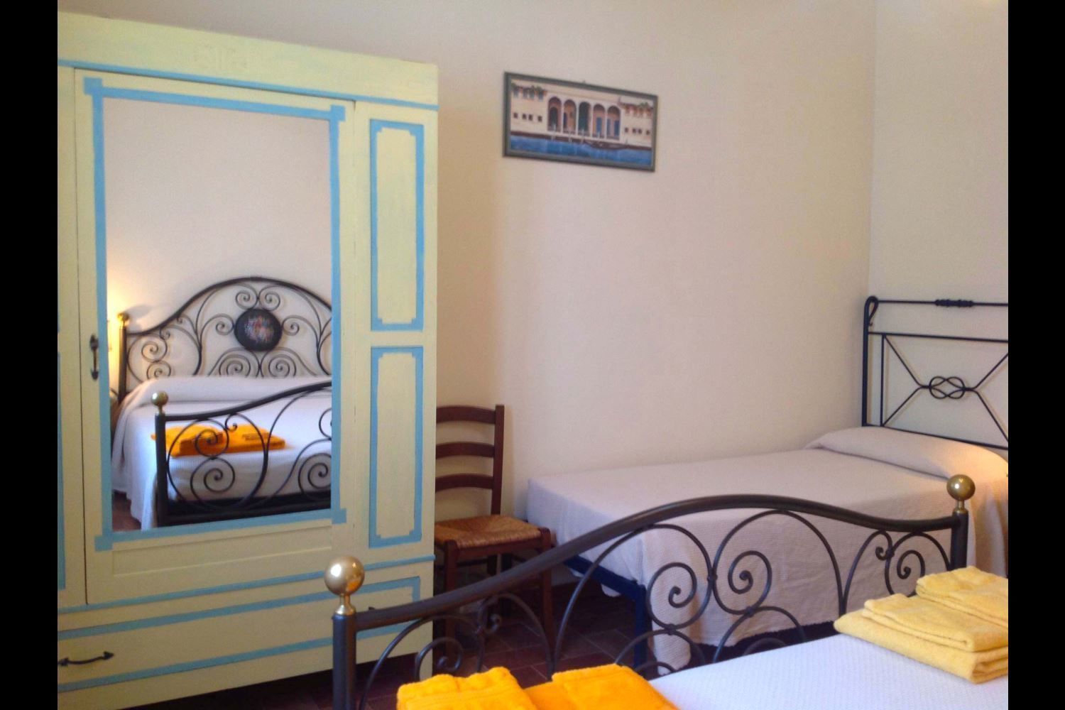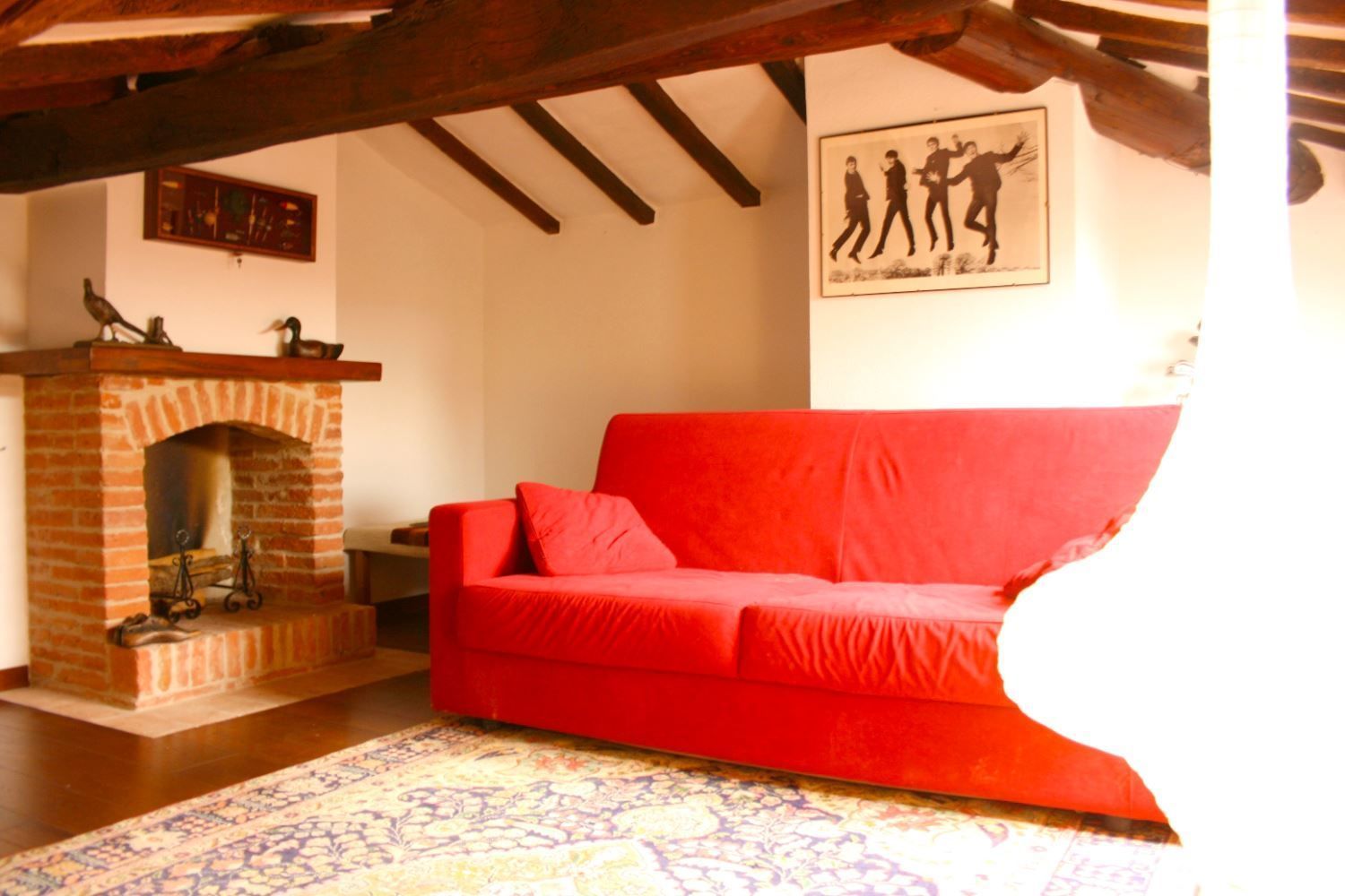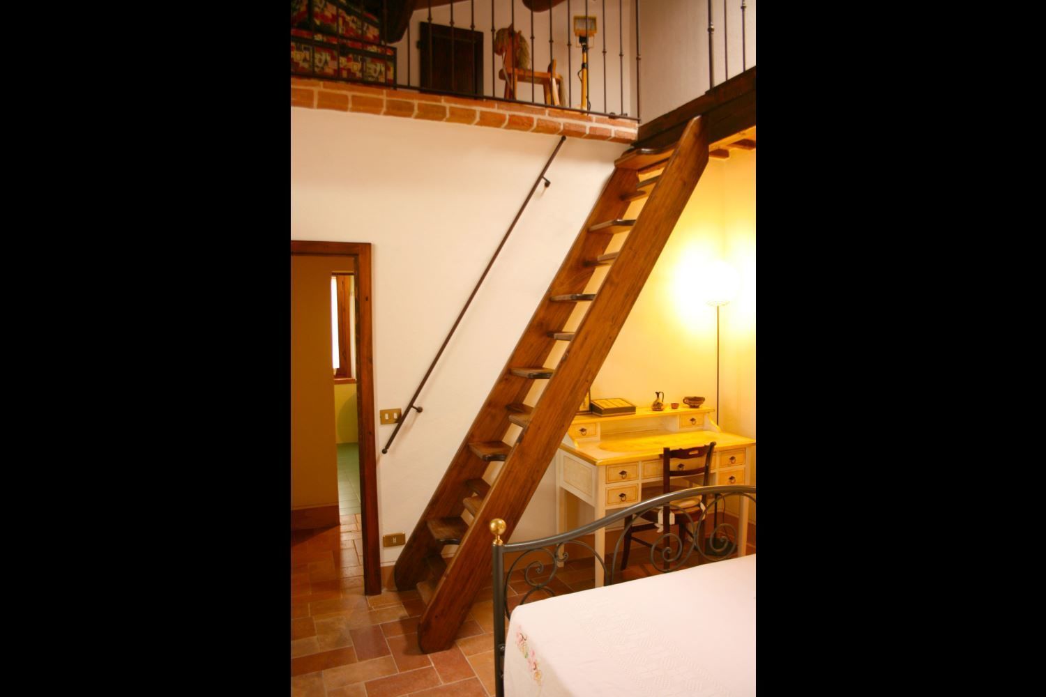 FIRST FLOOR: with access either through internal or external staircase, small study, bedroom with French bed, bathroom with shower, double bedroom with added single bed, double bedroom with wardrobe and private bathroom with shower. From this bedroom, going up a small wooden staircase you reach the attic with sofa and fireplace.