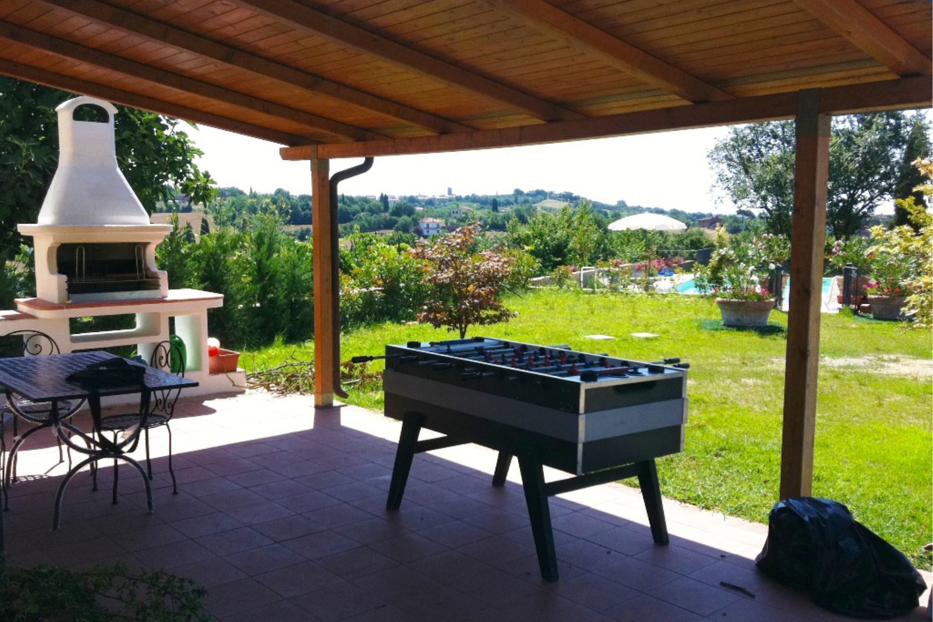 On one side of the house you will find the garden where you can spend pleasant days swimming in the pool (size 5x10 m - depth 1,20 - 1,50 m) and relaxing on the sunbeds or reading a book in the hammock. Adjacent to the kitchen there is a wooden porch furnished with a table, chairs, a barbecue and a table football, which will be a source of fun for adults and children alike.