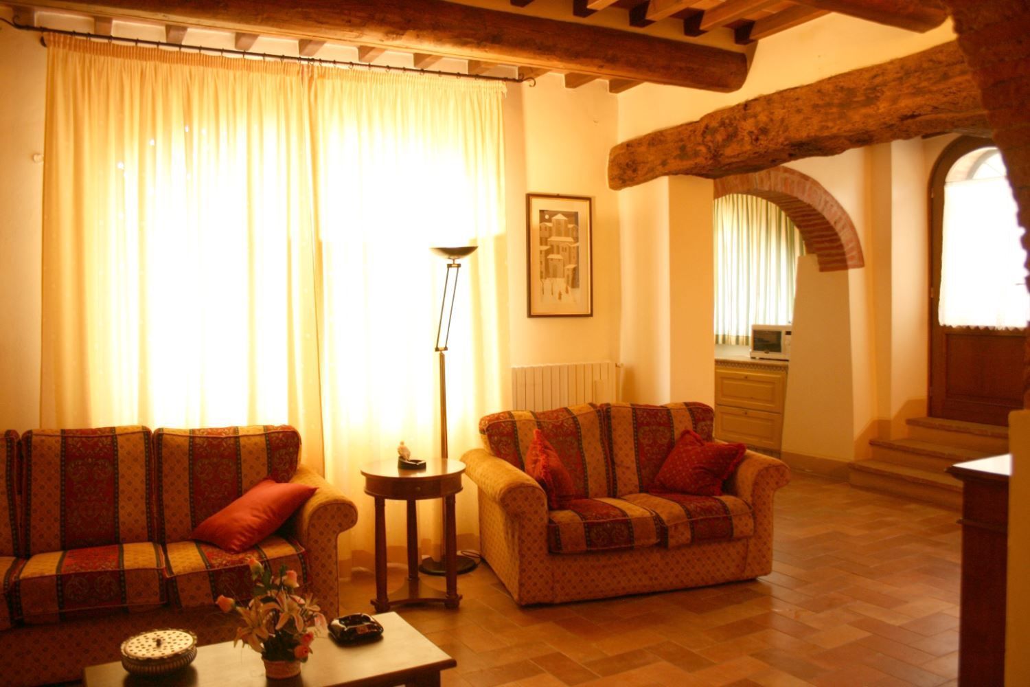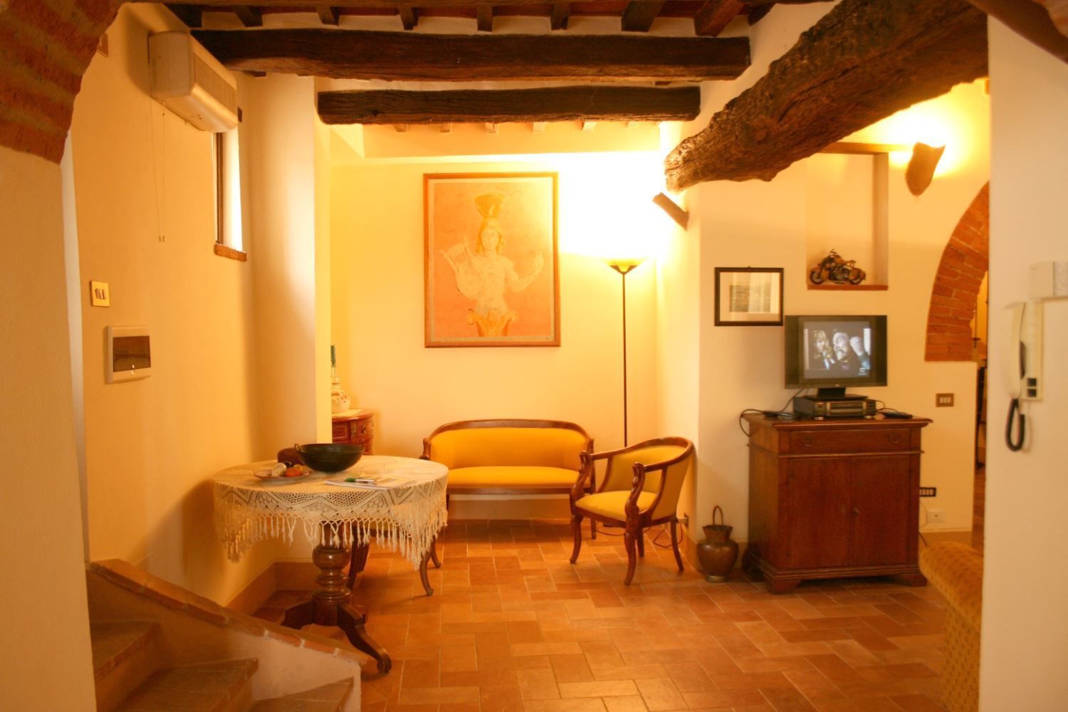 Portion of an old farmhouse with characteristic ceilings with wooden beams and brick arches, situated in a hilly position. The house takes its name from the ancient river 'Clanis', which crossed the Valdichiana and which was dammed during the Roman Empire because its flow of water often caused flooding in the city of Rome. This damming led to the swamping of the Valdichiana, which was reclaimed by Vittorio Fossombroni in the 18th century, and today is a fertile valley rich in cultivated fields, vineyards and olive groves.