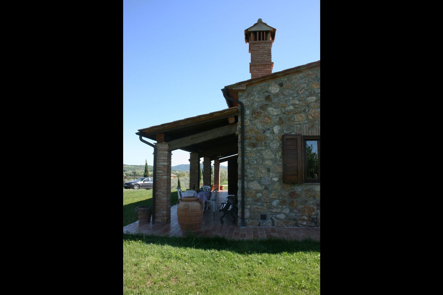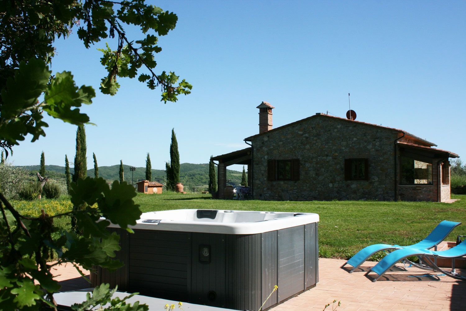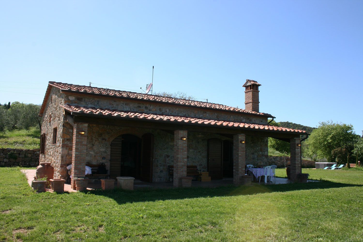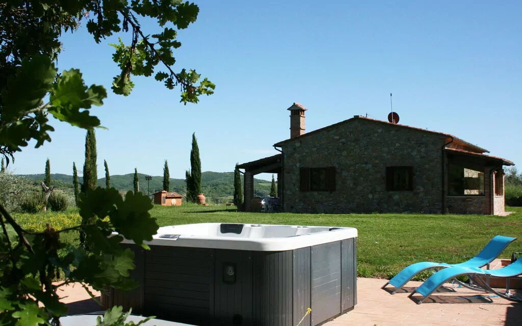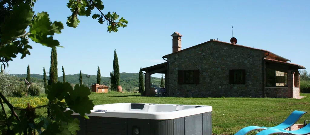 The Tuscan Maremma, territory of ancient tradition, still preserves its nature of harsh land, with strong contrasts and particularly fascinating colors. Its green and marvelous hills overlook the blue Tyrrheanian Sea and are marked by innumerable, typical villages such as Scarlino and its picturesque castle, from which you can admire the splendid view on Follonica Gulf and Elba Island. Le Pianacce is a lovely, stone villa, set on a sweet hill surrounded by silver olives and vineyards, making part of the owners farm. Less than 20 km far the sea and the small town of Follonica with its golden beaches and the numerous bathing establishments. The house, well-furnished and equipped (dishwasher, washing machine, satellite TV), is endowed with a panoramic garden with a private swimming pool (size 5 x 10 m - depth 1,40 m), and an external Jacuzzi (4 seats), deck-chairs, sun umbrellas and shower, a large porch equipped with table and chairs and barbecue to eat and relax outside. Le Pianacce will be ideal destination either for those who wish to enjoy the green Tuscan countryside or for those who would rather spend their days at the seaside, which can be reached in 15 minutes driving.